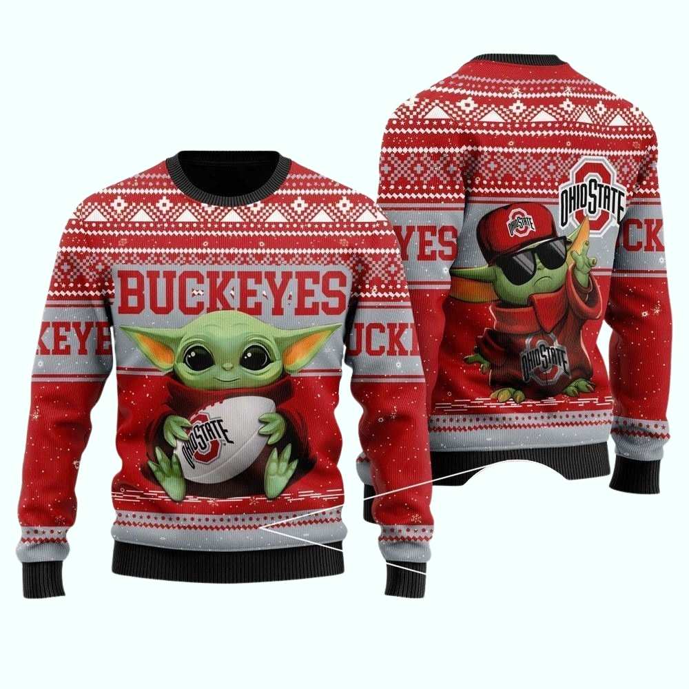 Get ready to showcase your love for the Ohio State Buckeyes this holiday season with our delightful Baby Yoda Ugly Sweater! Perfect for die-hard fans and festive spirits alike, this cozy sweater is your go-to choice for holiday parties, family gatherings, or simply snuggling up at home while binge-watching your favorite shows. With its unique design, this sweater is sure to be a conversation starter and bring a smile to everyone’s face!
