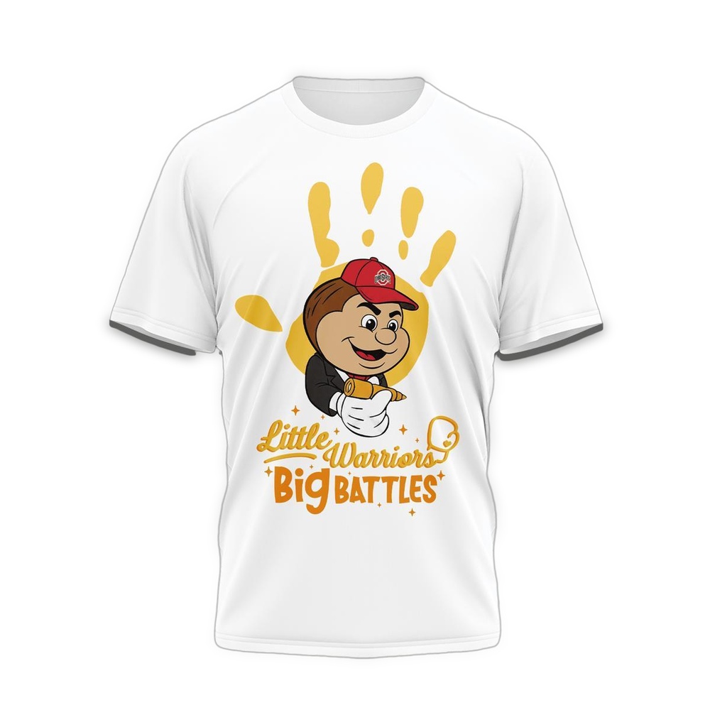 Show your support for the Ohio State Buckeyes and honor the brave little warriors battling childhood cancer with this unique all-over printed T-shirt. Perfect for fans of all ages, this graphic tee is not just a stylish choice; it’s a statement of resilience and hope. Whether you’re cheering from the stands, hanging out with friends, or simply looking to make a difference, this shirt is your go-to for casual wear that makes an impact.