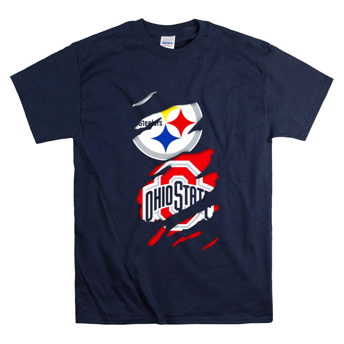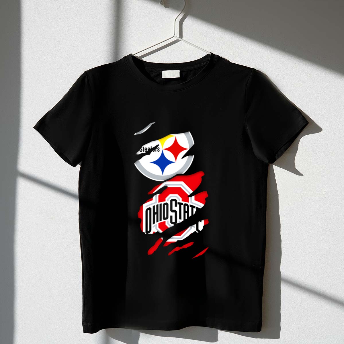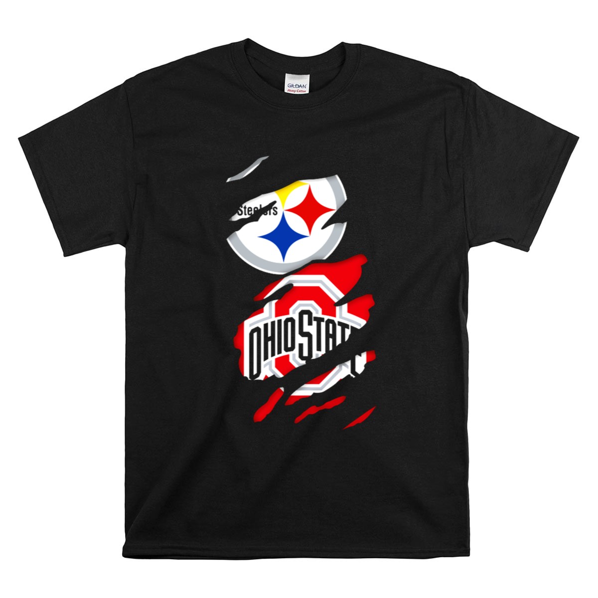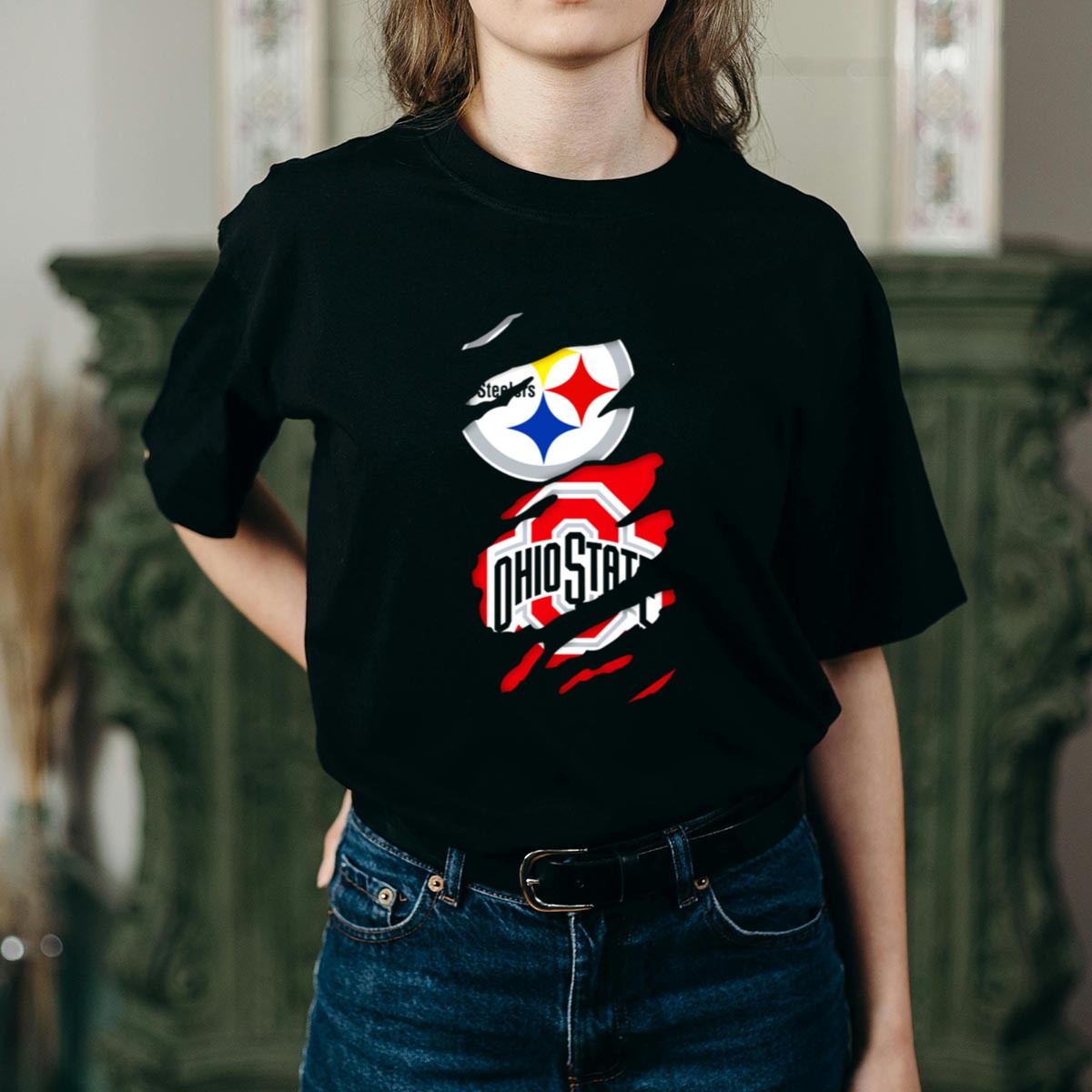 Show your team spirit with the Ohio State Buckeyes Steelers Rip T-Shirt, a must-have for any dedicated fan! This graphic-printed tee is perfect for casual wear, themed events, or just lounging around while cheering on your favorite teams. Made with a fan-made design, this shirt showcases your loyalty in a uniquely stylish way, all while being printed right here in the USA!