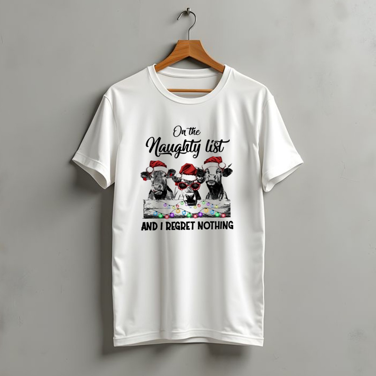Be the first to review “On The Naughty List And I Regret Nothing Cow Christmas Santa Hats Lights T-Shirt”
