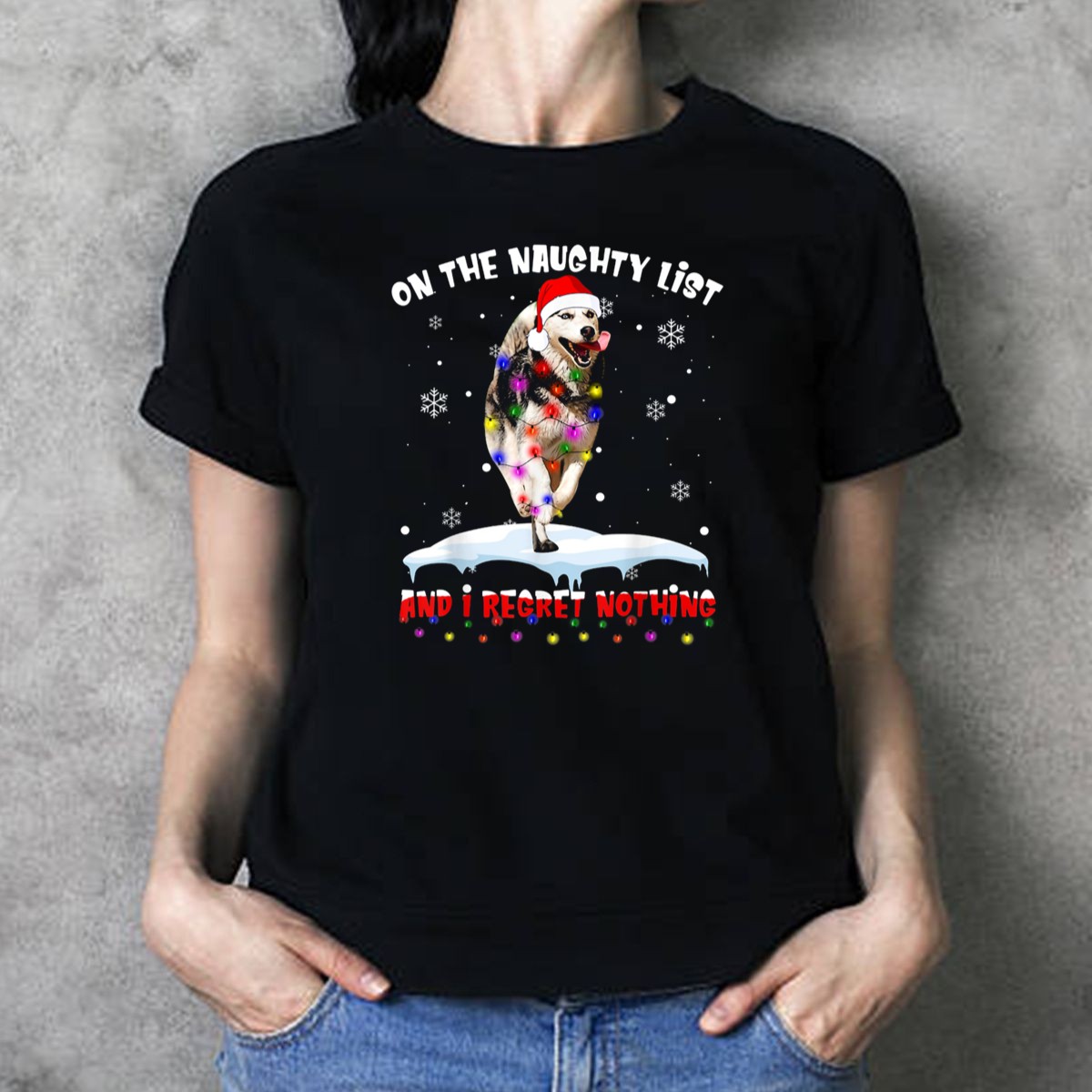 Get ready to spread some festive cheer with our “On The Naughty List And I Regret Nothing” T-shirt, featuring a playful husky in a Santa hat surrounded by twinkling Christmas lights and delightful snowflakes. Perfect for dog lovers and holiday enthusiasts alike, this shirt is ideal for casual wear, themed events, or just lounging around during the festive season. Crafted with a fan-made design printed in the USA, it’s a unique addition to your holiday wardrobe that combines comfort with a dash of humor.