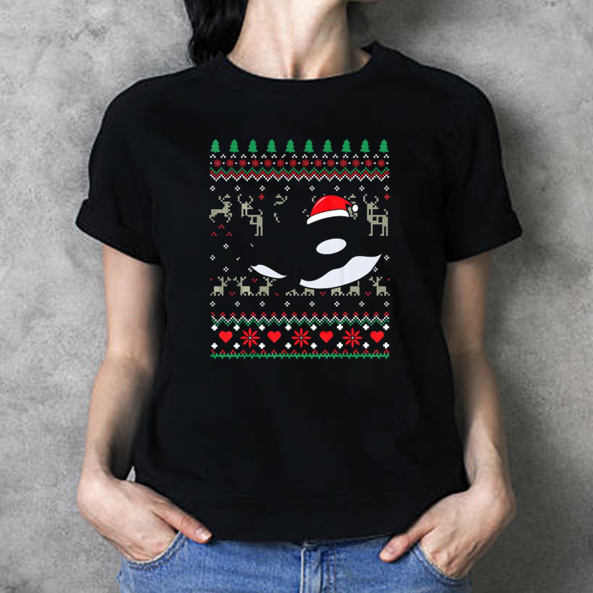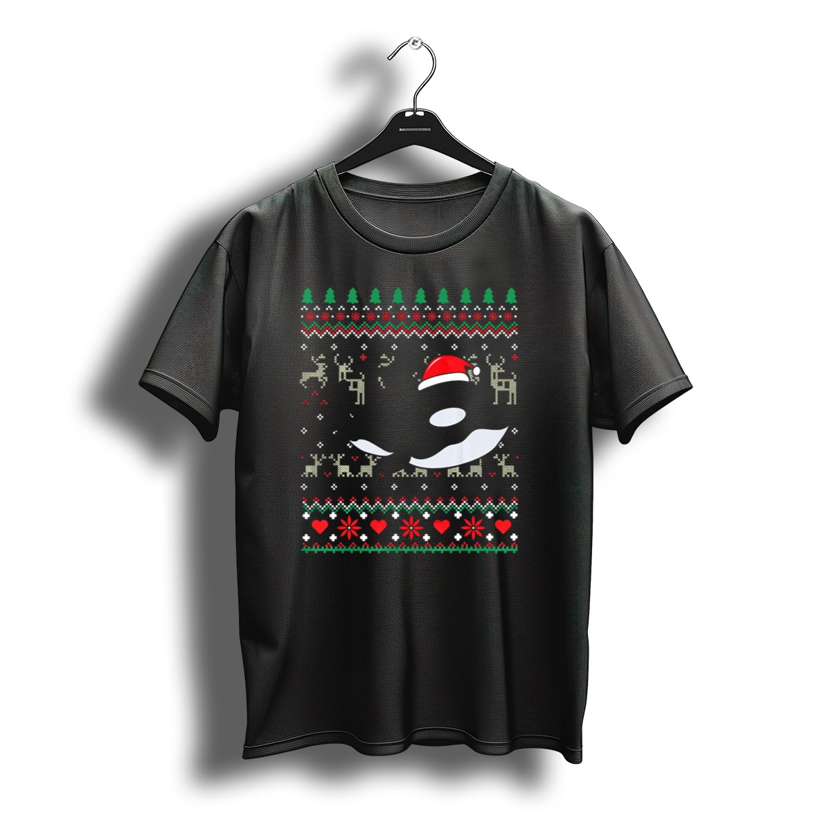 Celebrate the holiday season with our Orca Killer Whale Ugly Christmas Sweater T-Shirt, a perfect blend of festive fun and marine charm! This fan-made design is ideal for ocean lovers and holiday enthusiasts alike, making it a great choice for casual wear, themed events, or daily adventures. Printed in the USA, this shirt showcases a whimsical scene featuring an orca adorned with a Santa hat, reindeer, hearts, and trees, ensuring you stand out at any holiday gathering.