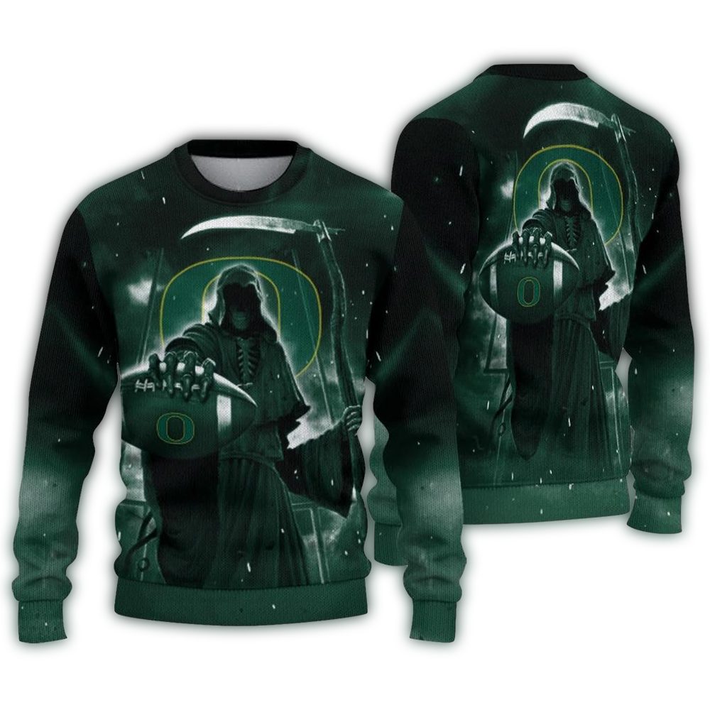Get ready to embrace the spirit of the holidays with our Oregon Ducks Reaper Scythe Ugly Sweater! Perfect for die-hard fans and festive enthusiasts alike, this sweater is your go-to choice for holiday parties, cozy nights in, or cheering on your team in style. Its unique design combines a playful take on the classic ugly sweater theme with a nod to Oregon Ducks pride, making it a standout piece for any winter occasion.