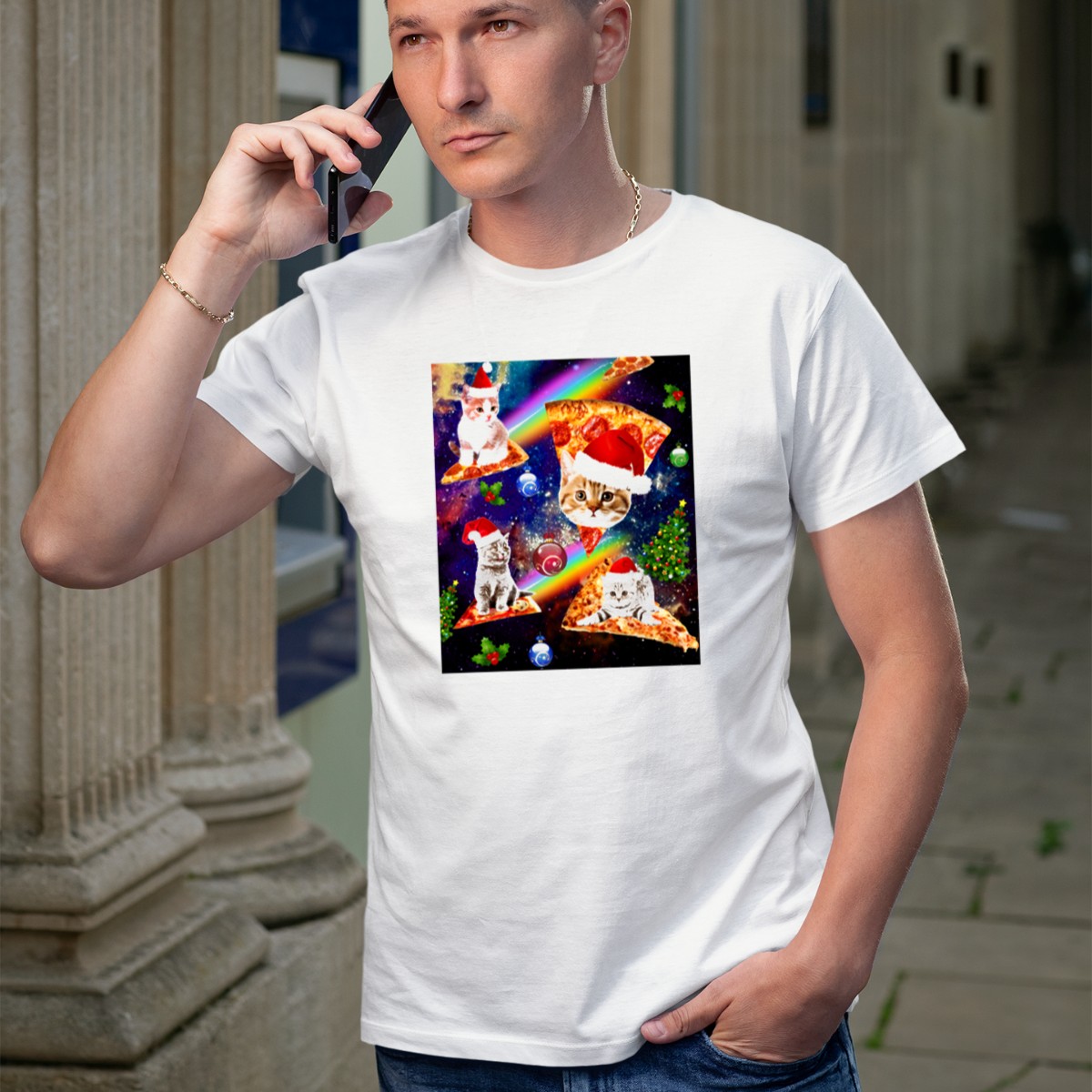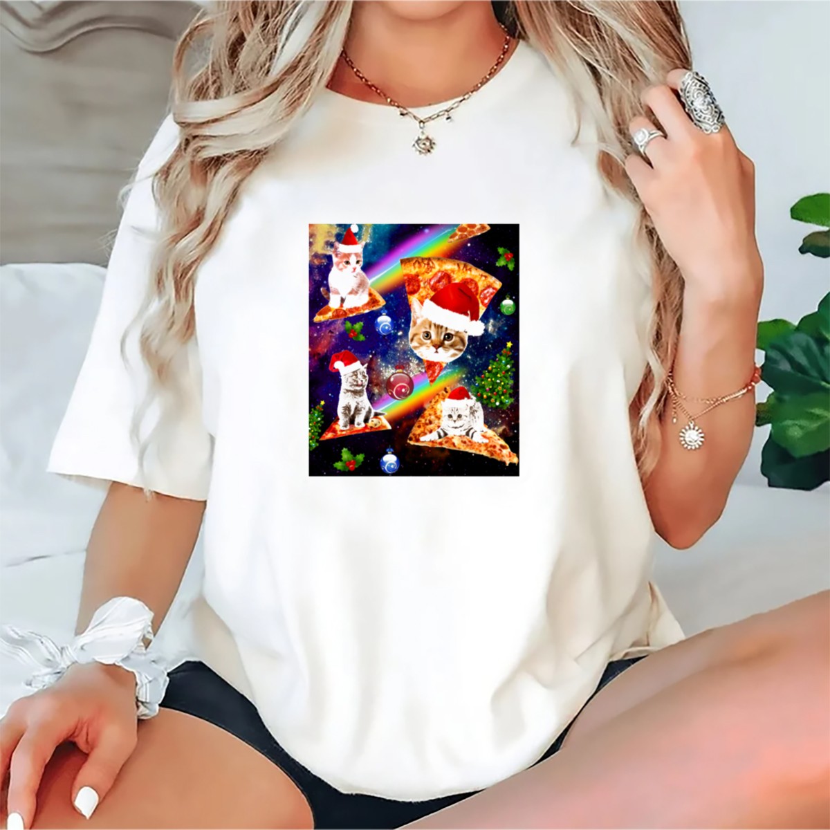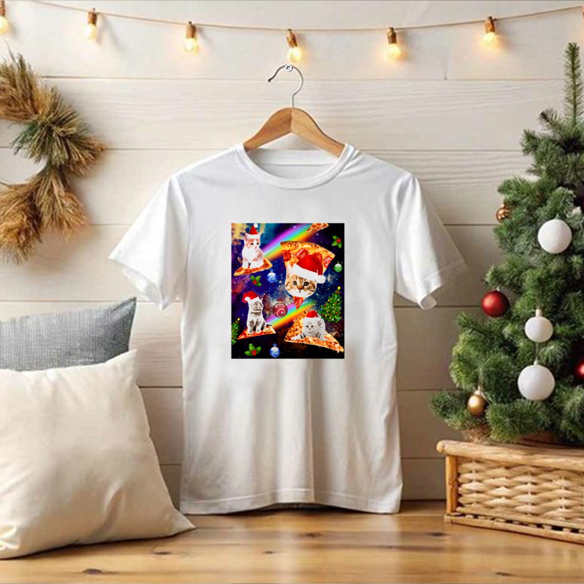 Be the first to review “Outer Space Christmas Cats With Santa Hats Riding Pizza In Galaxy T-Shirt”
