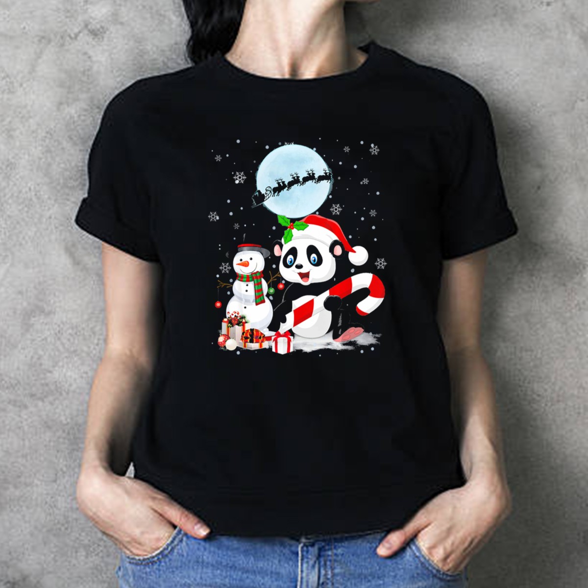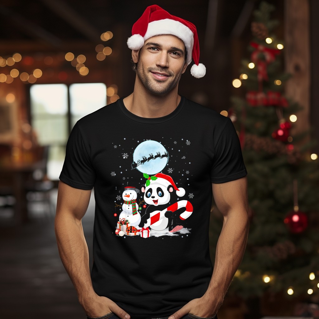 Be the first to review “Panda Santa Hat With Candy Cane And Snowman Under Christmas Moon With Sleigh T-Shirt”