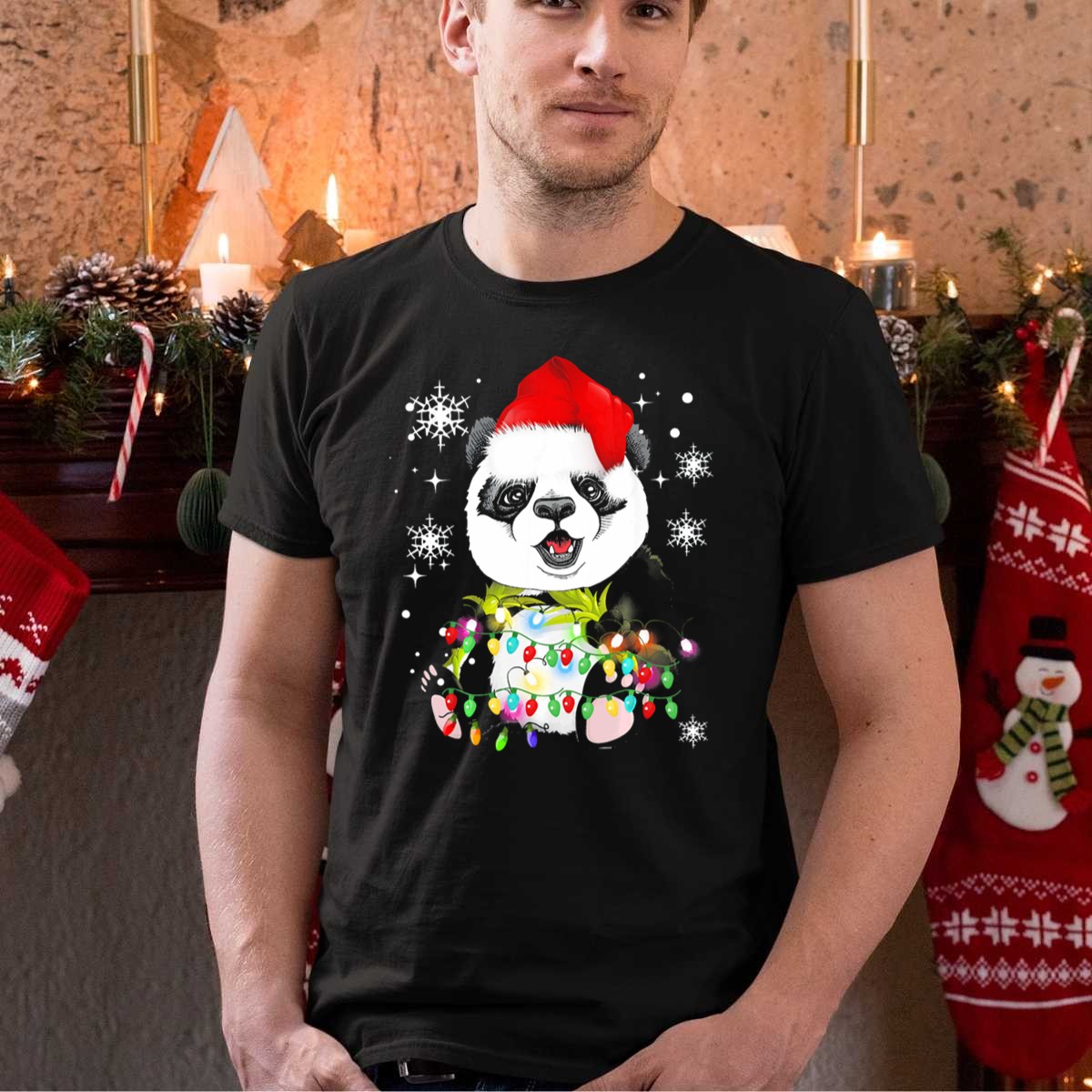 Panda With Santa Hat And Christmas Lights Surrounded By Snowflakes T Shirt
