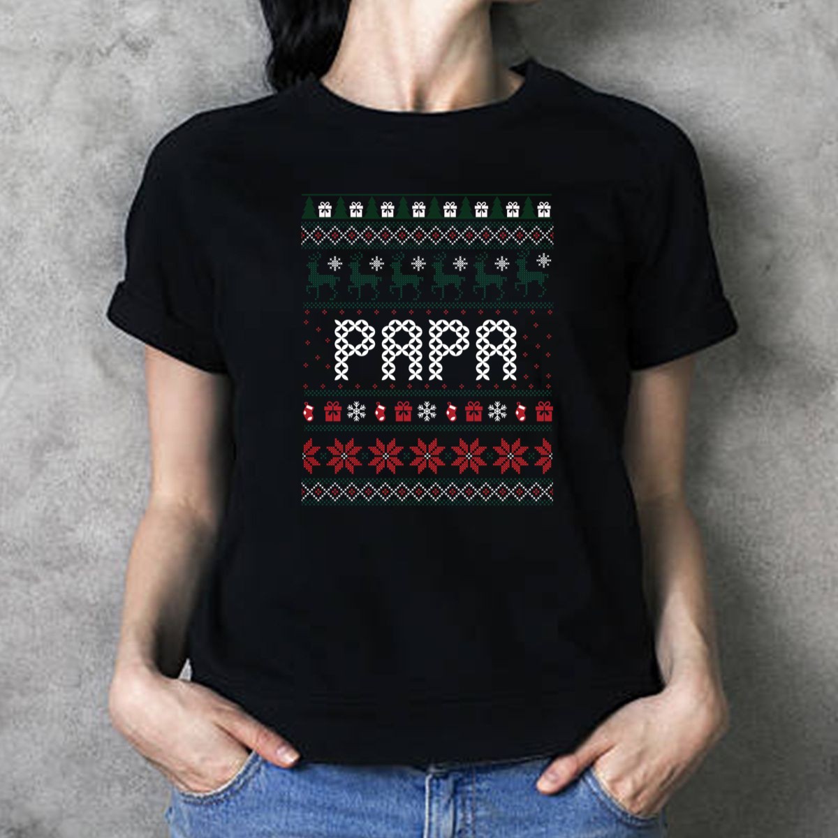 Celebrate the holiday season with our Papa Christmas Ugly Sweater Style Reindeer Snowflakes T-Shirt, perfect for festive gatherings and casual outings. This fan-made design captures the spirit of Christmas with a whimsical reindeer and snowflake print, making it an ideal choice for those who love to spread cheer. Crafted for comfort and style, this shirt is great for family gatherings, themed events, or simply showcasing your holiday spirit in daily wear.