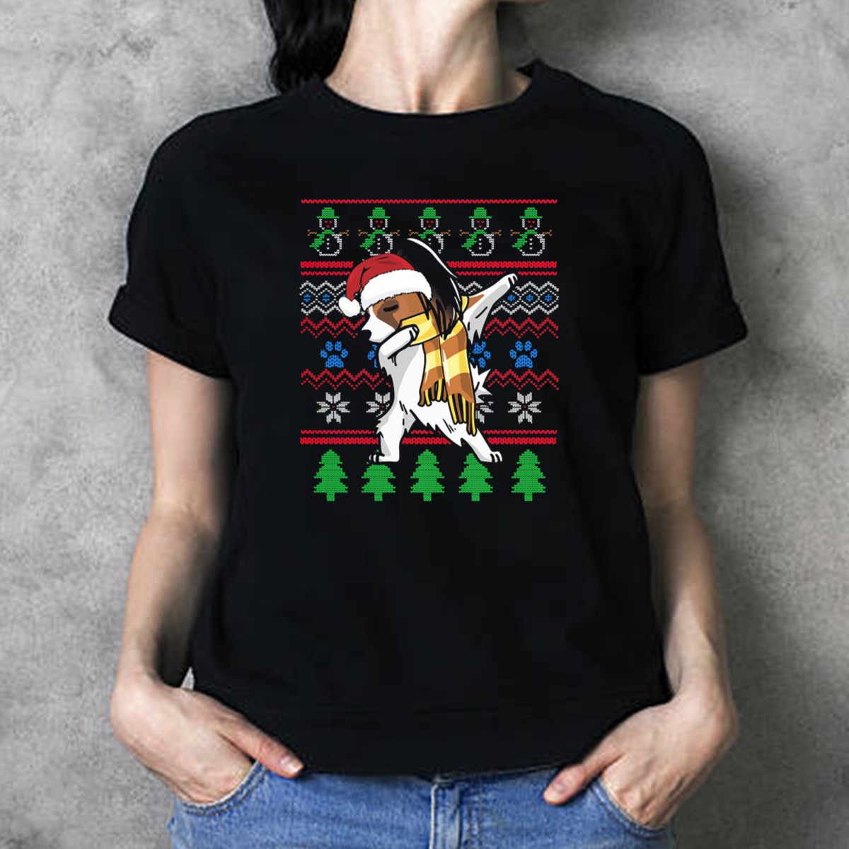 Embrace the festive spirit with our Papillon Dabbing Christmas Sweater Style T-Shirt, featuring an adorable design of a playful pup sporting a Santa hat and scarf. Perfect for dog lovers and holiday enthusiasts alike, this shirt adds a cheerful touch to any casual outing, themed event, or daily wear during the holiday season. Made for comfort and style, it’s a unique addition to your wardrobe that showcases your love for both pets and Christmas cheer!