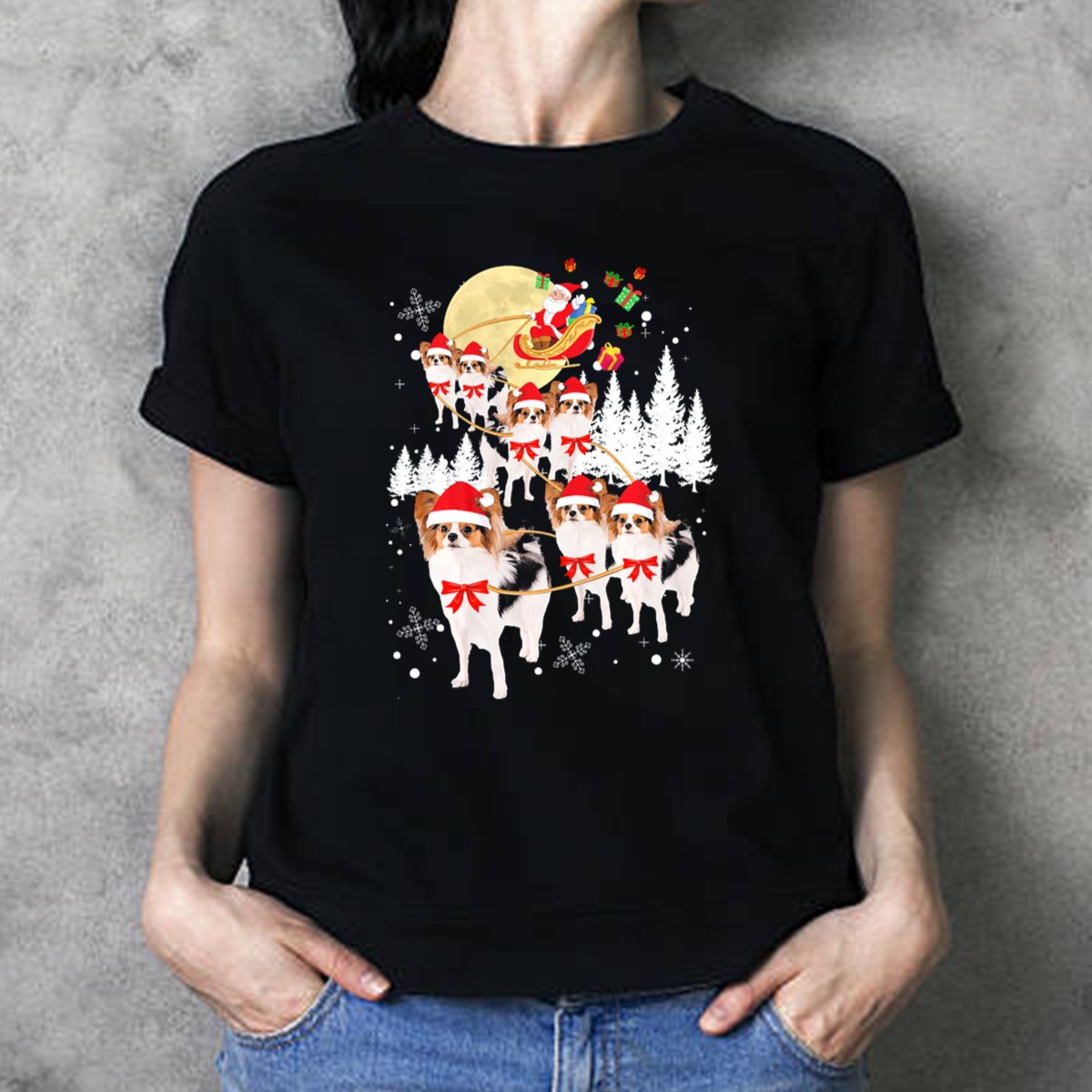 Papillon Dogs Santa Reindeer Christmas Moon Snowflakes Trees T-Shirt