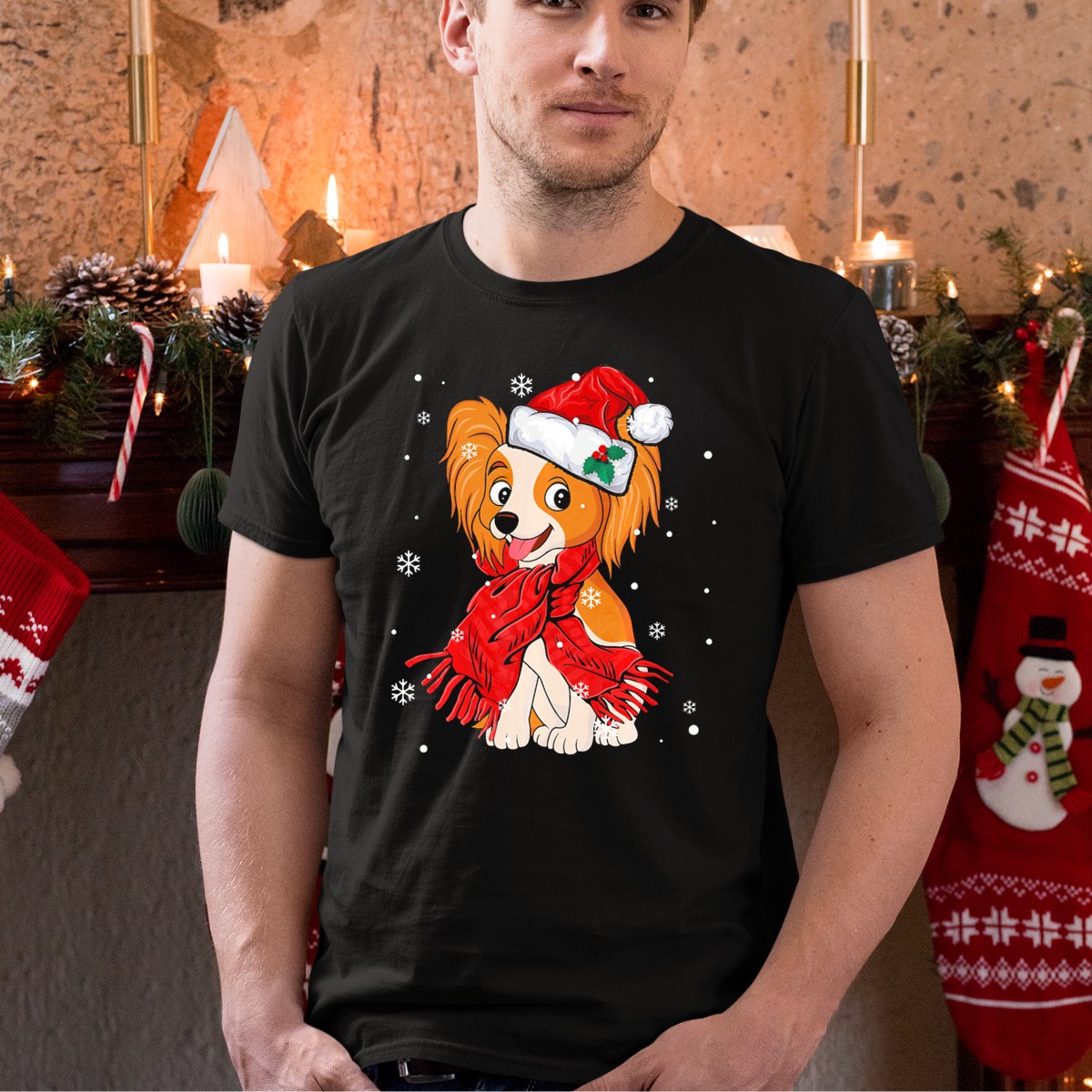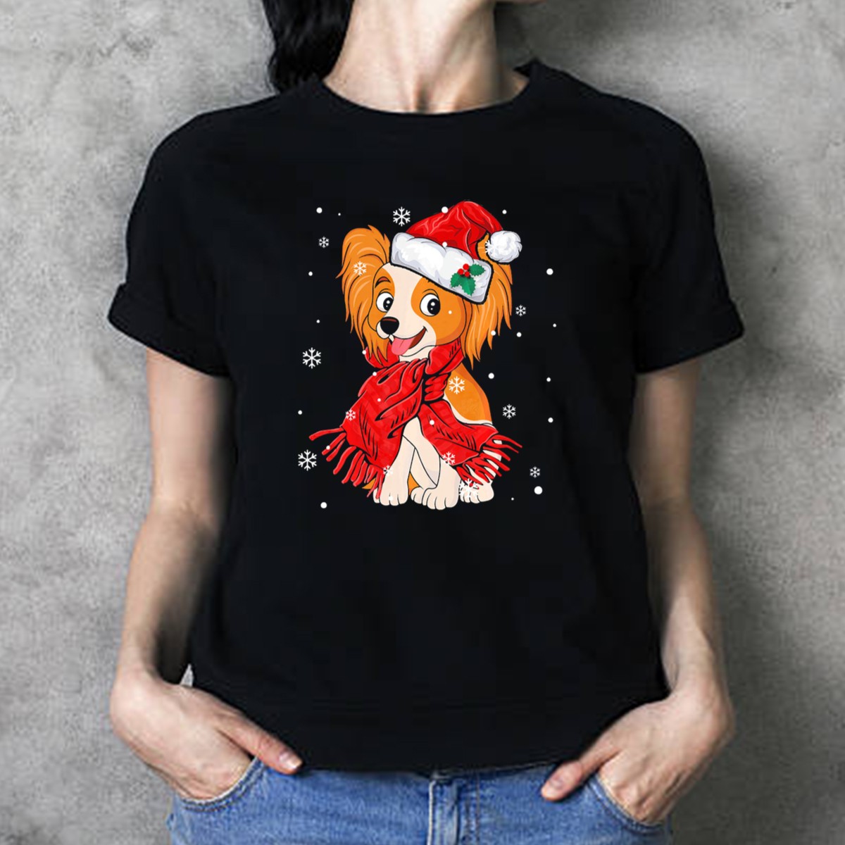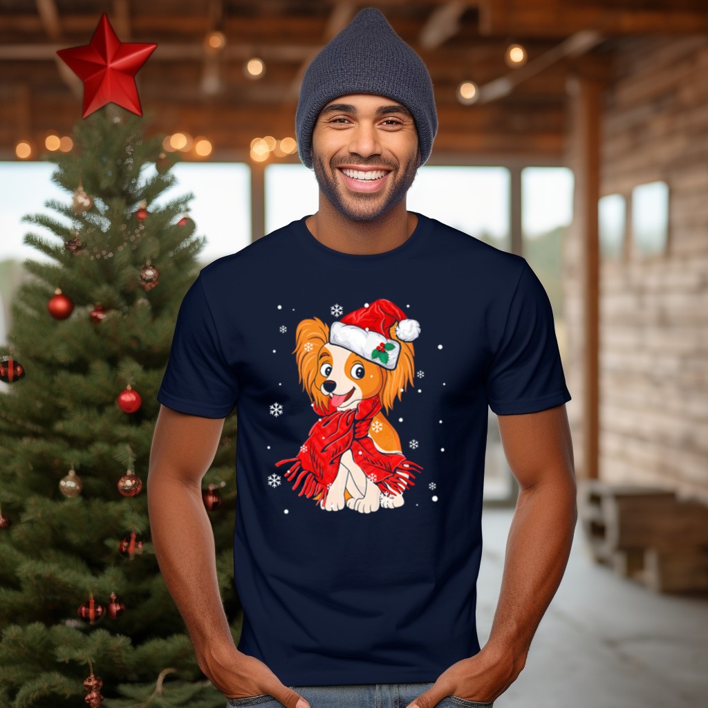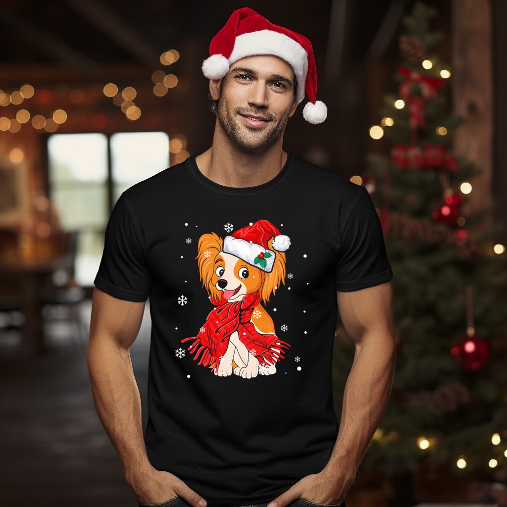 Celebrate the festive season in style with our Papillon Santa Hat Red Scarf Christmas Snowflakes T-Shirt! This delightful design is perfect for dog lovers and adds a cheerful touch to your casual wear. Ideal for holiday gatherings, themed events, or simply spreading joy during the daily hustle, this fan-made graphic tee is printed in the USA, ensuring quality and uniqueness.