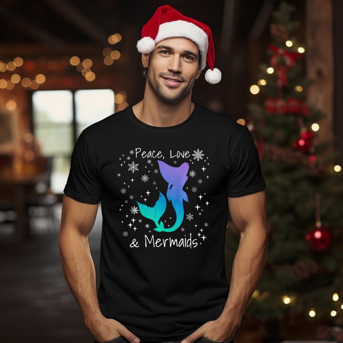Celebrate the magic of the holiday season with our Peace Love Mermaids Christmas Snowflakes T-Shirt! Designed for mermaid lovers and festive spirits alike, this shirt combines whimsical charm with cozy comfort, making it the perfect choice for casual wear, themed events, or simply spreading joy during the holidays. Featuring a unique fan-made design printed right here in the USA, this tee is a delightful way to express your love for mermaids and the festive spirit all year round.