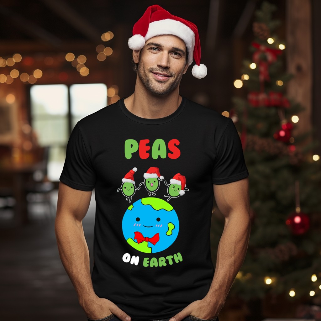 Celebrate the holiday spirit with our Peas On Earth Christmas Festive Green Globe Santa Hats T-Shirt, designed for those who love to spread joy and laughter during the festive season. This whimsical tee is perfect for family gatherings, holiday parties, or simply lounging around at home while sipping hot cocoa. Made with care and printed in the USA, it’s a must-have for anyone looking to add a touch of fun to their Christmas wardrobe.