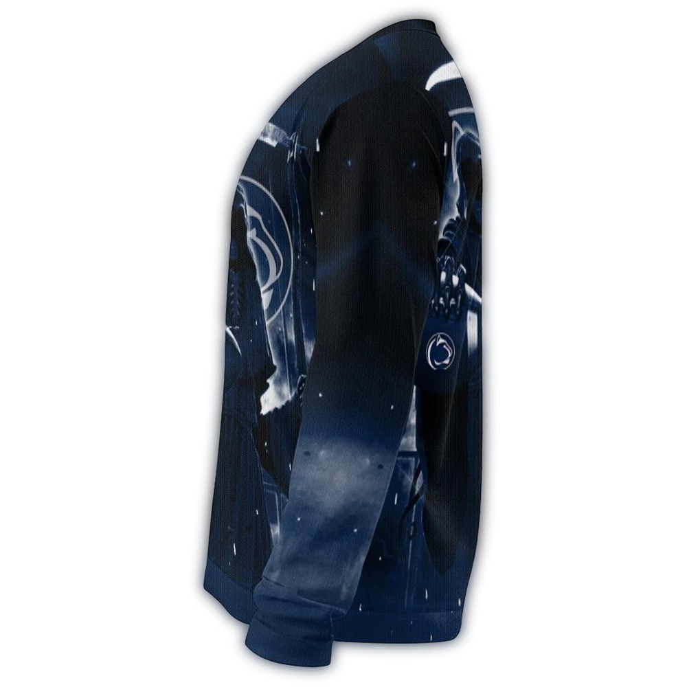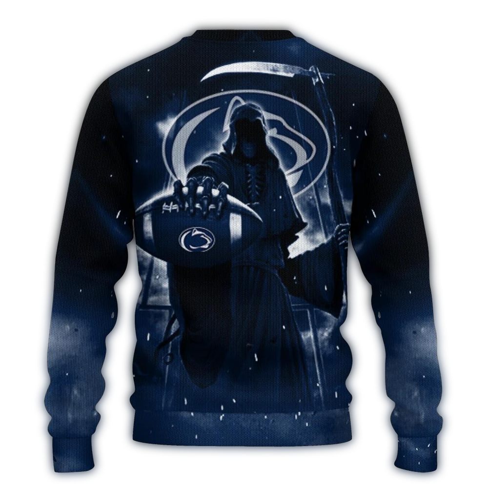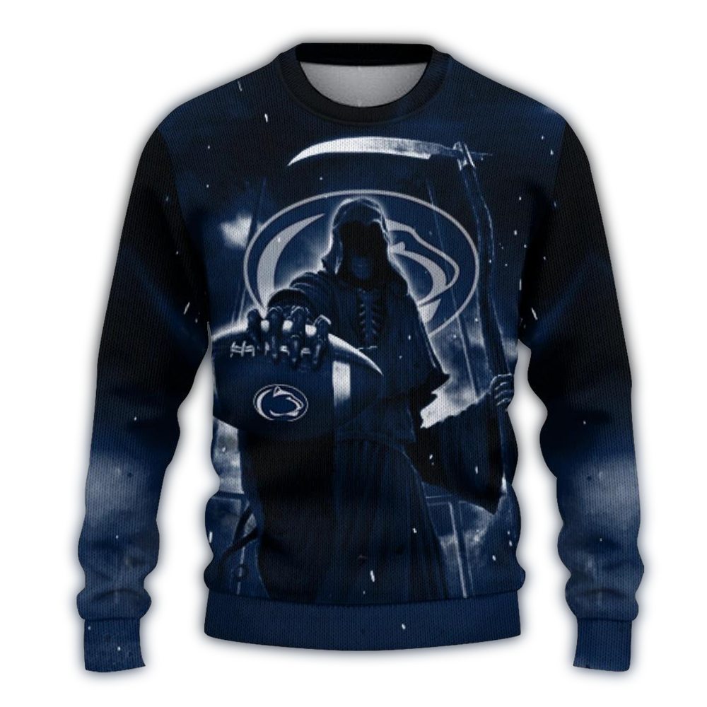 Embrace your inner fan with our Penn State Nittany Lions Skull Death Reaper Scythe Ugly Sweater! Perfect for die-hard supporters, this sweater is ideal for game days, holiday parties, or cozy nights in. Stand out from the crowd with its unique design that combines festive cheer with a touch of edgy flair, making it a must-have for those who love to showcase their team spirit in a fun way.