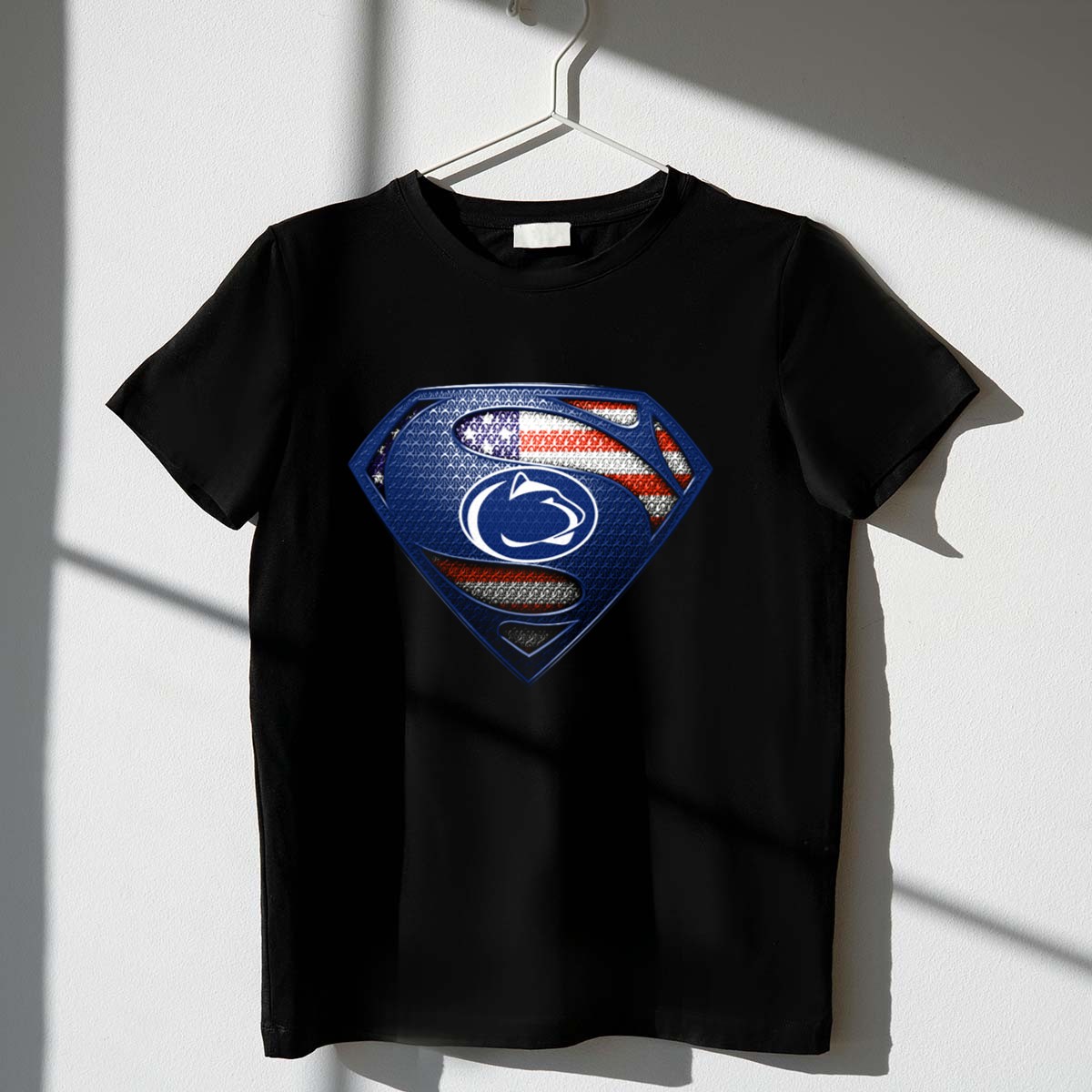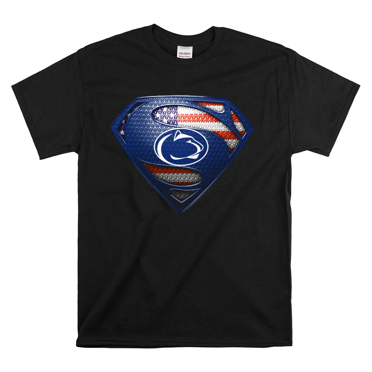 Show your pride for the Penn State Nittany Lions with this unique Superman Shield American Flag T-Shirt! Perfect for fans of all ages, this shirt combines your love for the team with a bold and patriotic design. Whether you’re at a game, hosting a watch party, or enjoying a casual day out, this eye-catching tee is an ideal choice for any occasion. Made with care and printed in the USA, it’s a standout piece for true supporters.