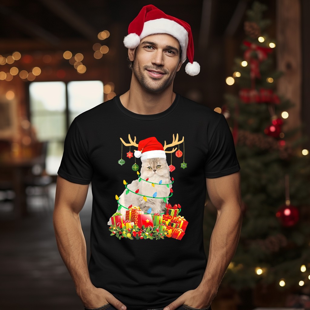 Persian Cat With Reindeer Antlers And Santa Hat Surrounded By Christmas Gifts And T-Shirt