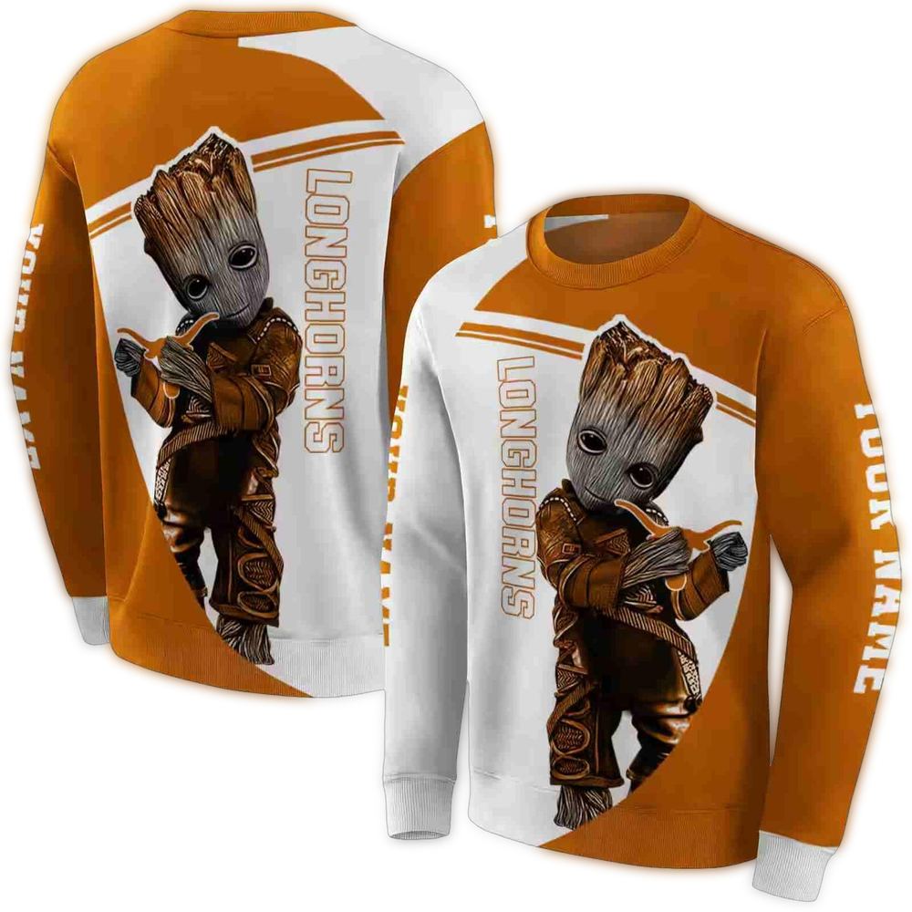 Embrace your love for the Texas Longhorns with our Personalized Baby Groot Hold Logo All-Over Print Sweatshirt. Perfect for fans of all ages, this cozy sweatshirt is ideal for casual outings, game days, or simply lounging at home. Its unique design blends playful elements with team spirit, making it a standout piece in any streetwear closet.