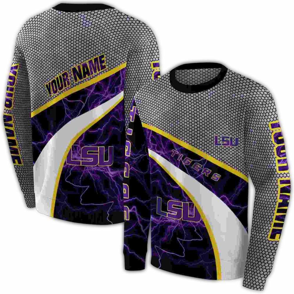 Elevate your streetwear game with our Personalized LSU Tigers Hexagonal Mesh Purple Black Gray All Over Print Sweatshirt. Perfect for both die-hard fans and casual wearers, this unique sweatshirt combines team spirit with a modern aesthetic. Ideal for game days, casual outings, or lounging at home, its all-over print design makes a bold statement that stands out in any setting.