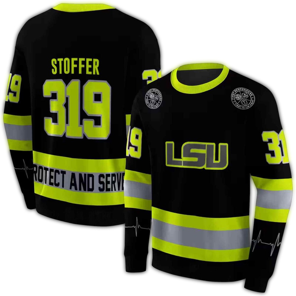 Elevate your streetwear game with our Personalized LSU Tigers Safety Motif Black Neon Green All Over Print Sweatshirt. Designed for fans who want to showcase their team spirit in style, this vibrant sweatshirt is perfect for casual outings, game days, or lounging at home. The eye-catching neon green accents against a sleek black background make it a standout piece that combines comfort and modern flair.