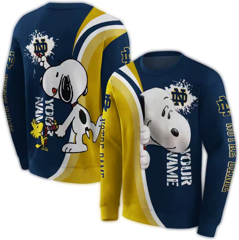 Introducing the Personalized Notre Dame Fighting Irish Peeking Snoopy All Over Print Sweatshirt, a must-have for fans looking to showcase their love for the Fighting Irish in a unique way. This sweatshirt is perfect for casual outings, cozy nights in, or even cheering from the stands at your favorite game. With its eye-catching design and relaxed fit, it brings a modern twist to your streetwear collection.