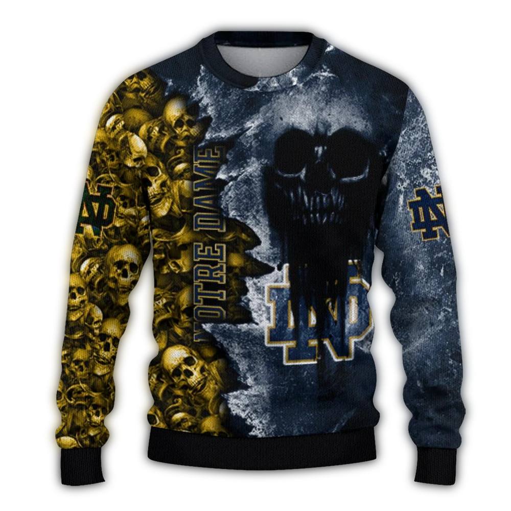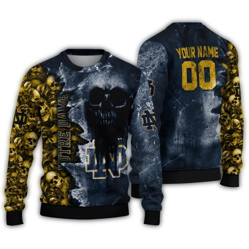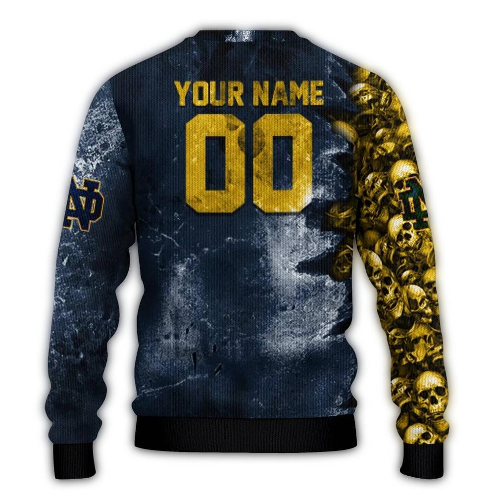 Unleash your holiday spirit with our Personalized Notre Dame Fighting Irish Skull Collage Ugly Sweater! Perfect for fans who want to showcase their team pride with a twist of quirky charm, this sweater is the ultimate conversation starter at any winter gathering. From festive parties to cozy nights in, this unique design will keep you warm and stylish while you cheer on your favorite team!