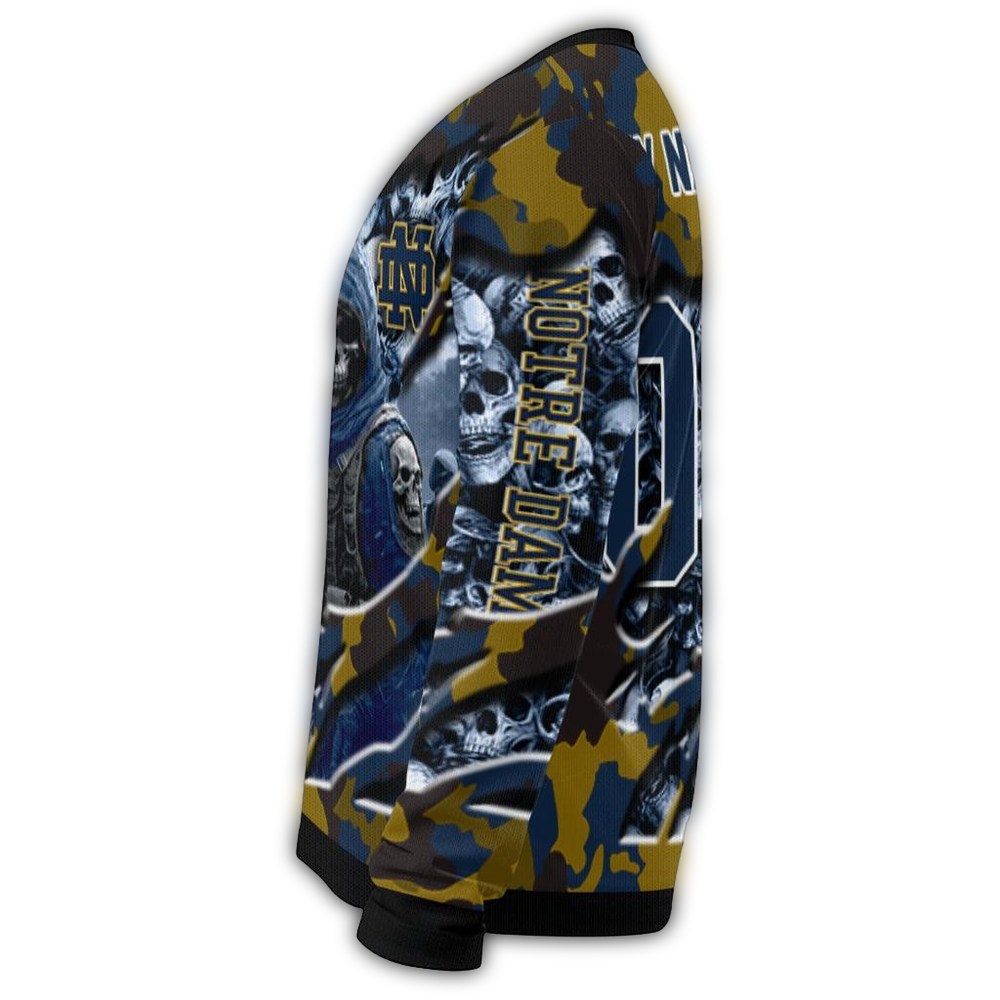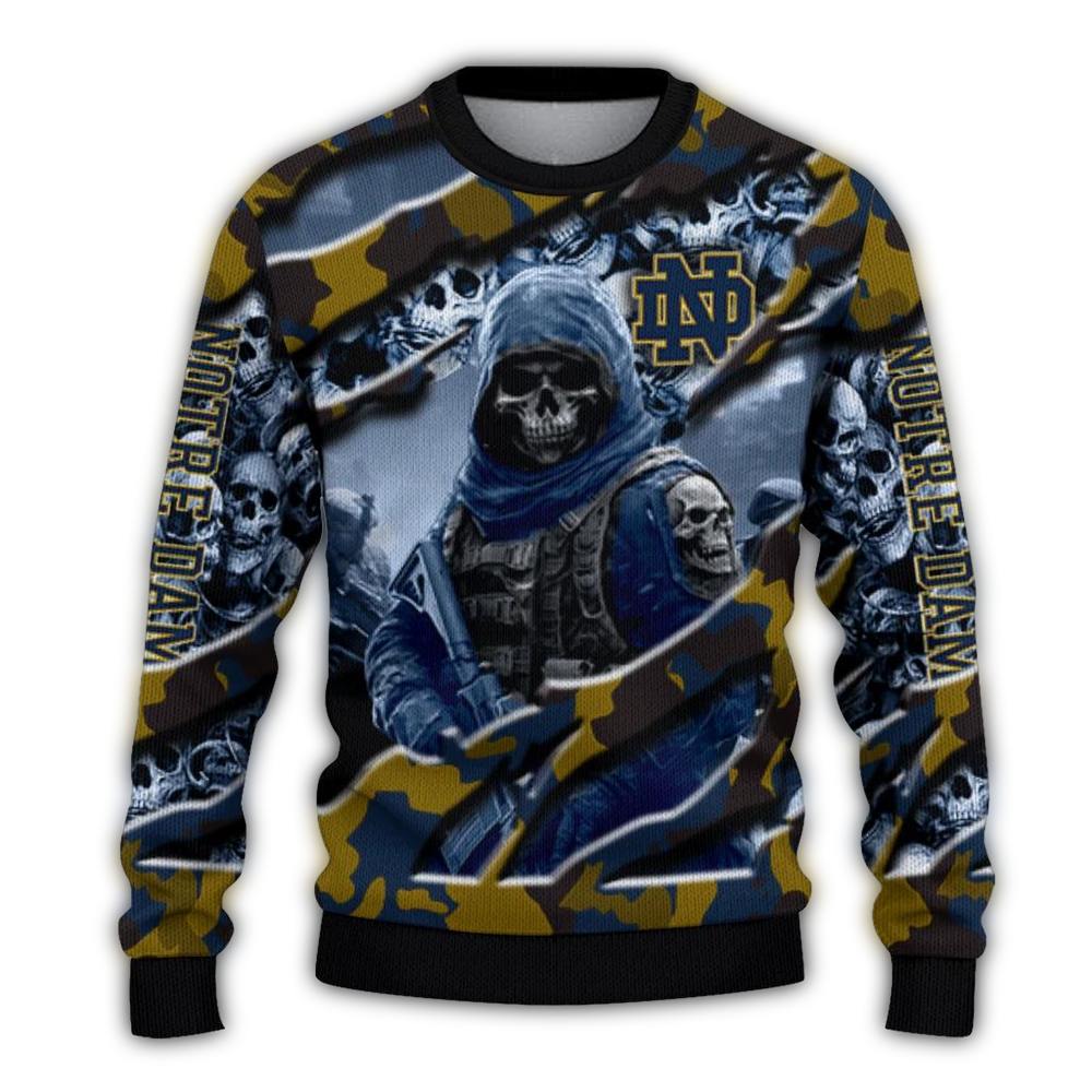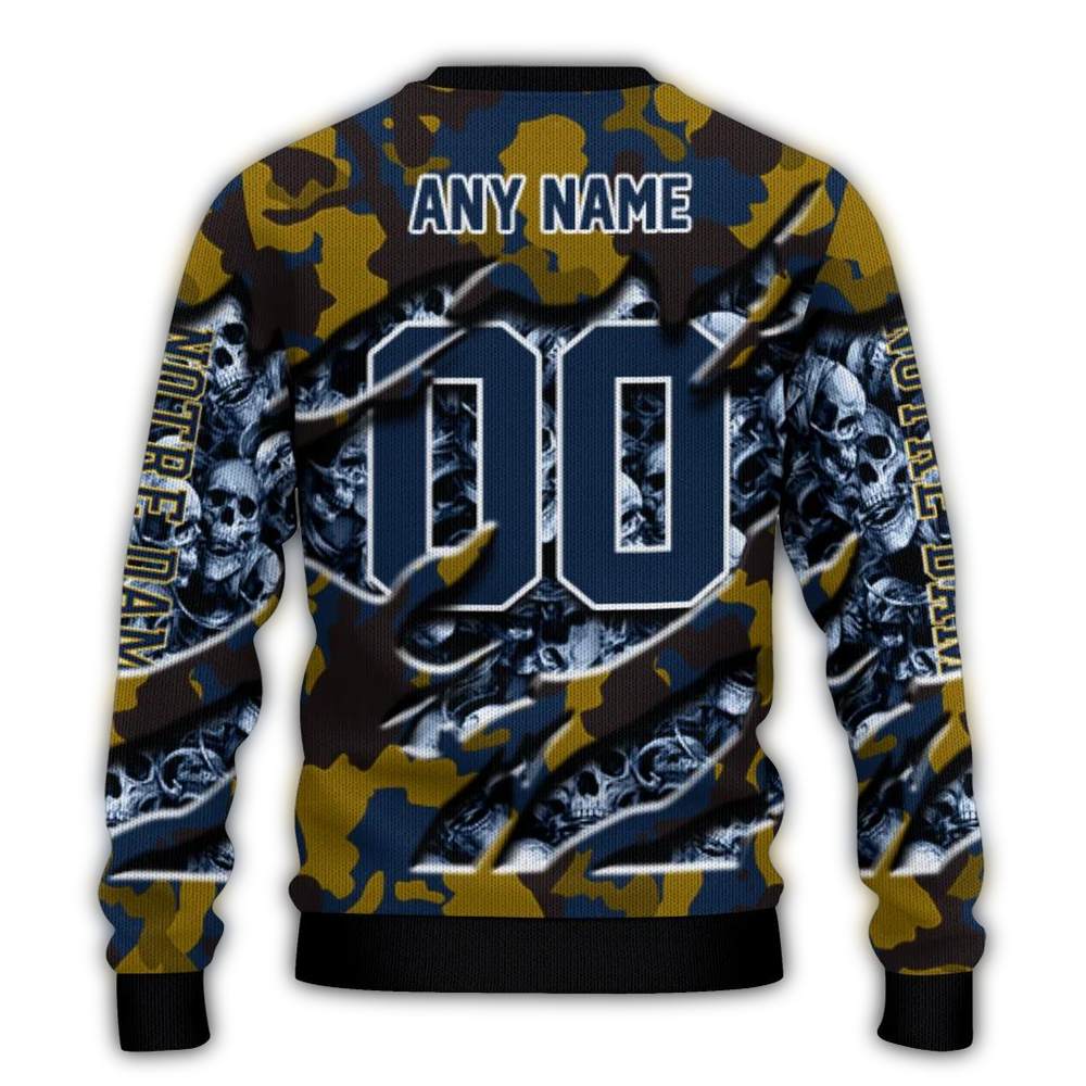 Bring some spirited fun to your winter wardrobe with our Personalized Notre Dame Fighting Irish Skull Horde Ugly Sweater! Perfect for die-hard fans, this cozy piece is ideal for game days, holiday parties, or simply lounging around while showing off your team pride. Its unique design blends festive flair with a touch of edginess, making it a standout choice for any casual occasion.