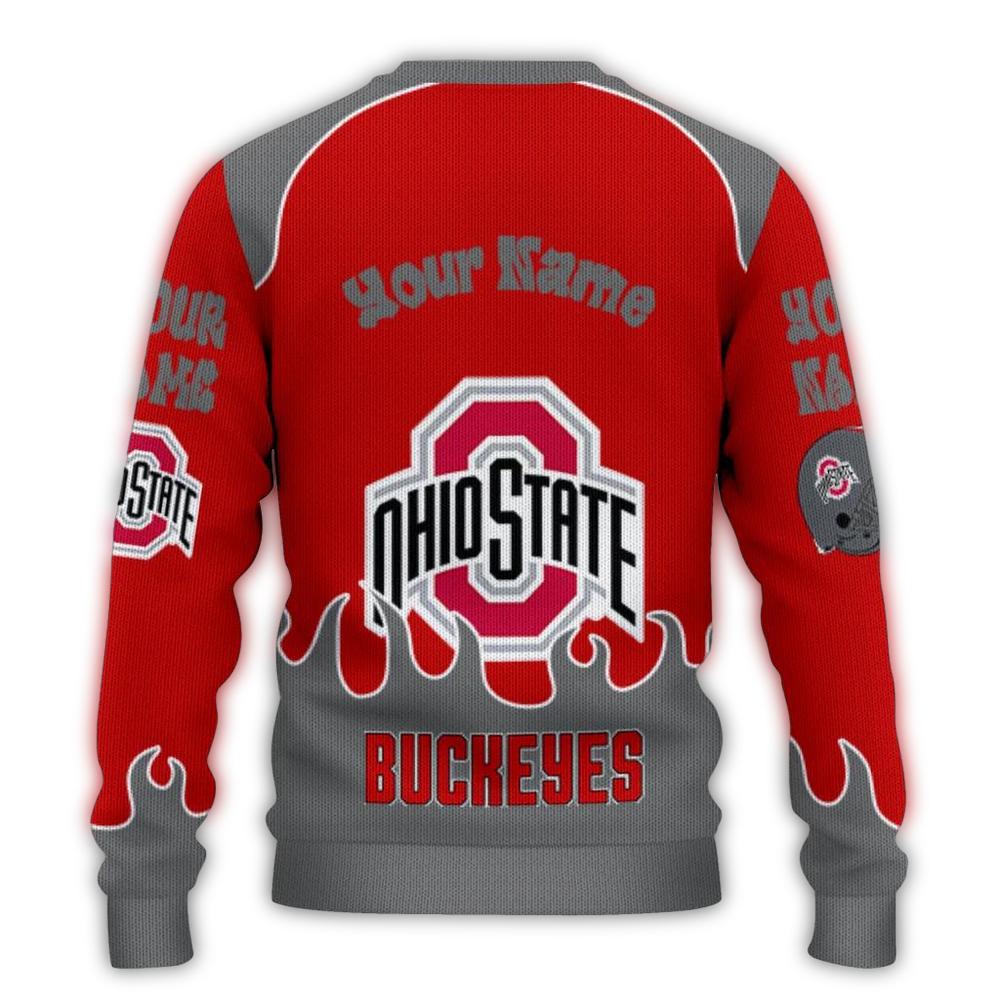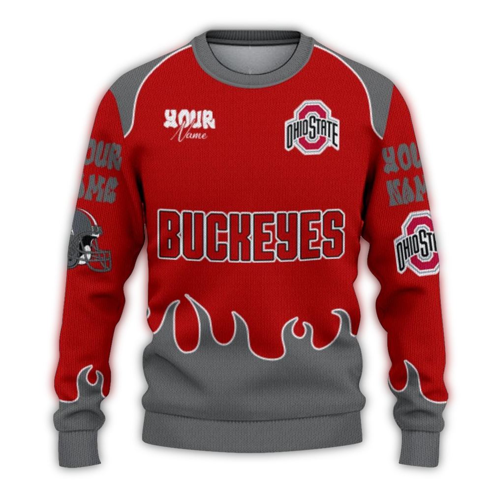 Get ready to ignite your winter festivities with our Personalized Ohio State Buckeyes Flame Border Ugly Sweater! Perfect for die-hard Buckeyes fans, this cozy and festive piece is ideal for holiday parties, game days, or simply lounging at home while showing off your team spirit. With its unique flame border design, this sweater stands out in a crowd, ensuring you’ll be the life of the party!