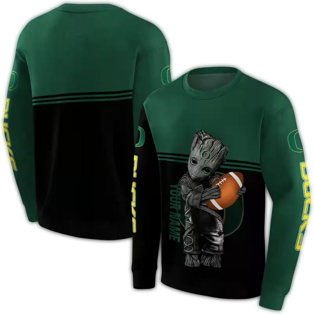 Introducing the Personalized Oregon Ducks Baby Groot AOP Sweatshirt, a trendy addition for any fan looking to showcase their team spirit in style. Perfect for casual outings, lounging at home, or hitting the gym, this sweatshirt combines comfort and flair, making it an ideal choice for anyone who loves to express their unique personality through fashion.