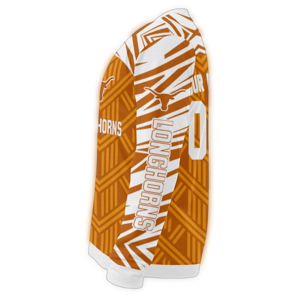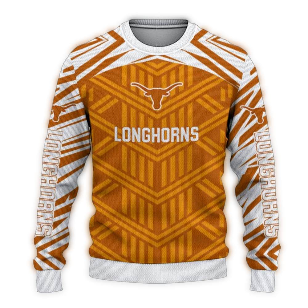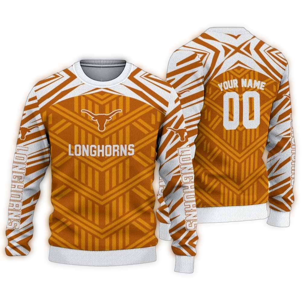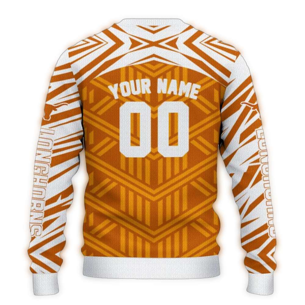 Get ready to show off your Texas pride with our Personalized Texas Longhorns Chevron Pattern Ugly Sweater! Perfect for fans of all ages, this cozy sweater is ideal for holiday parties, game days, or just lounging at home while cheering on your team. Its unique chevron pattern combined with the iconic Longhorns logo makes it a standout piece that brings festive cheer and spirited style to any winter wardrobe.