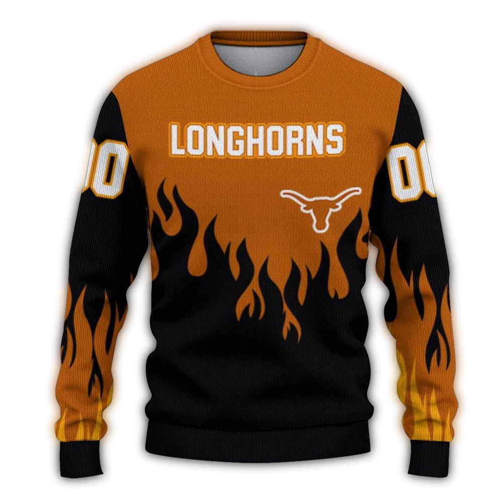 Get ready to showcase your Texas pride with our Personalized Texas Longhorns Flame Outline Ugly Sweater! Perfect for fans and friends alike, this festive piece is ideal for holiday parties, cozy nights in, or cheering on your team from the stands. Its unique design combines the bold spirit of the Longhorns with a fun, ugly sweater flair that’s sure to turn heads and spark conversations!