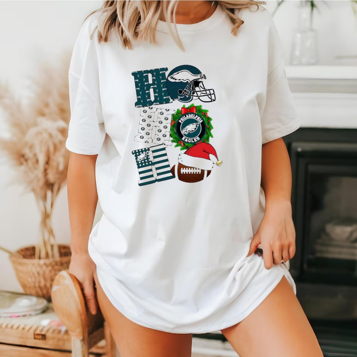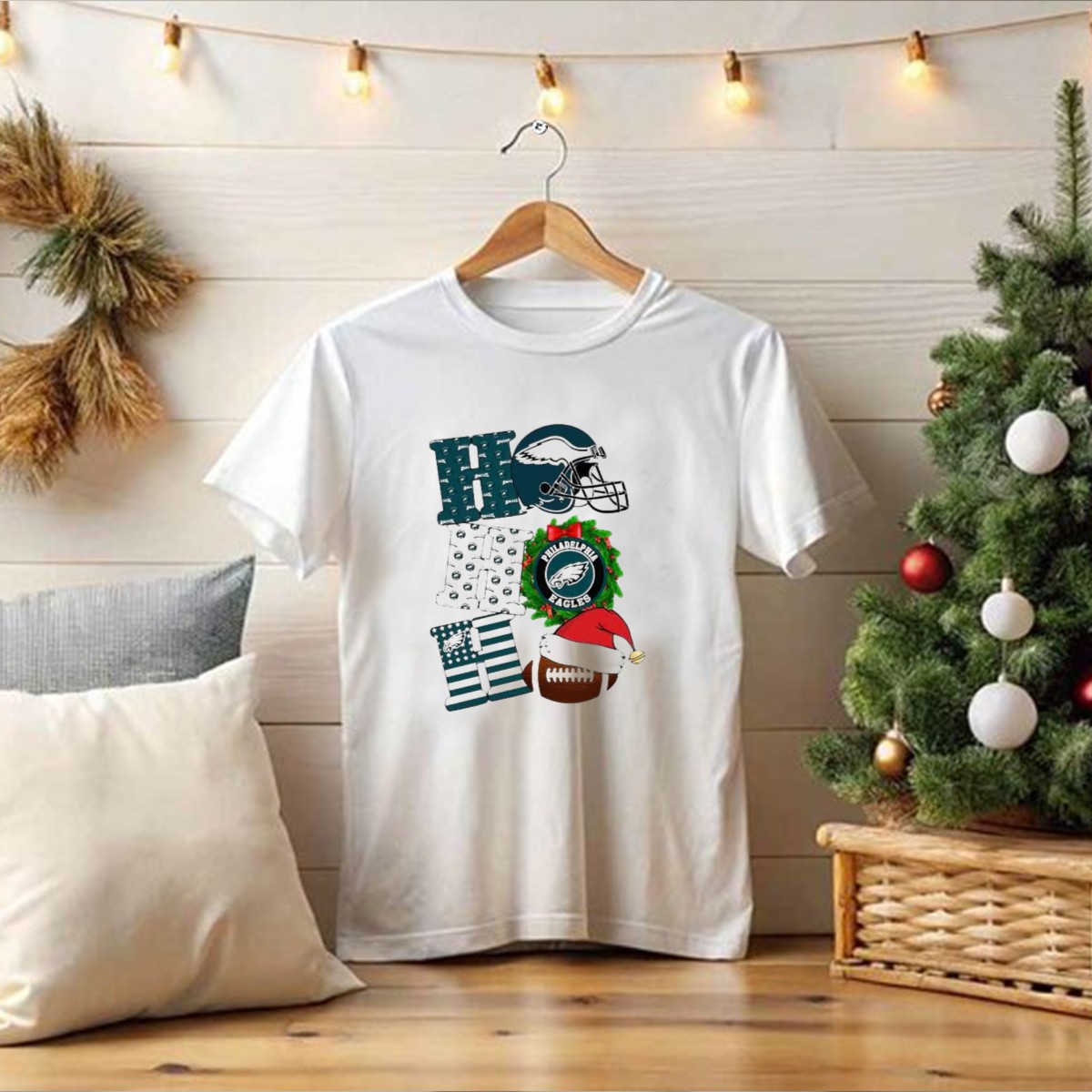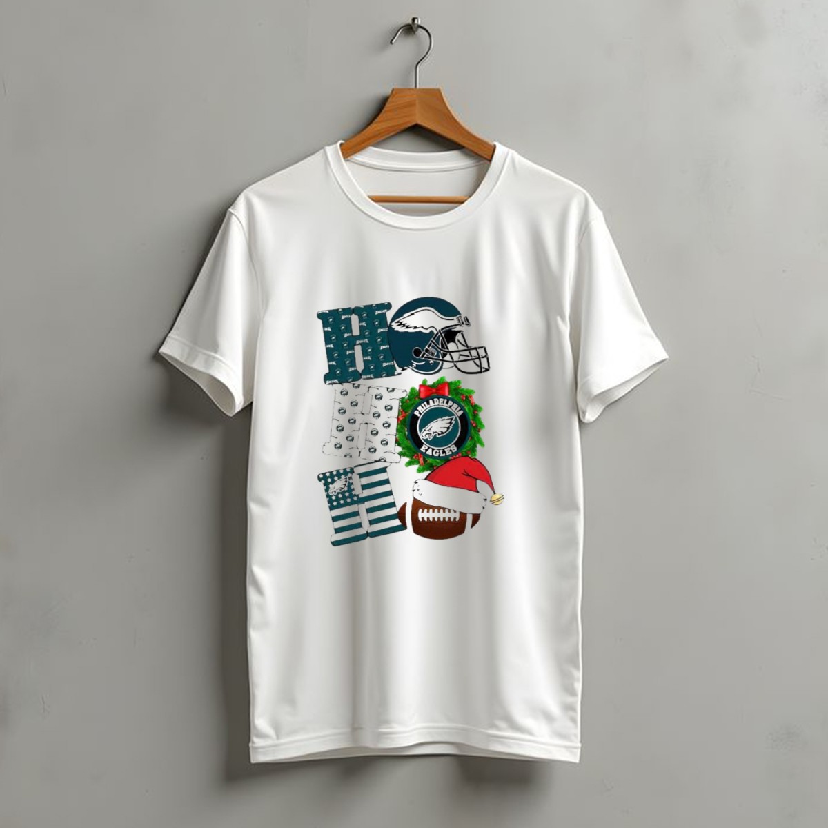 Celebrate the holiday season with a festive twist on your favorite football team! This Philadelphia Eagles Ho Ho Ho Merry Christmas Football Helmet Wreath Santa Hat T-Shirt is perfect for fans who want to blend their passion for the game with holiday cheer. Ideal for casual outings, themed events, or daily wear during the festive season, this shirt is a unique way to showcase your team spirit while spreading joy and laughter. Made with love and printed in the USA, it’s a must-have for every Eagles fan looking to add some holiday flair to their wardrobe.