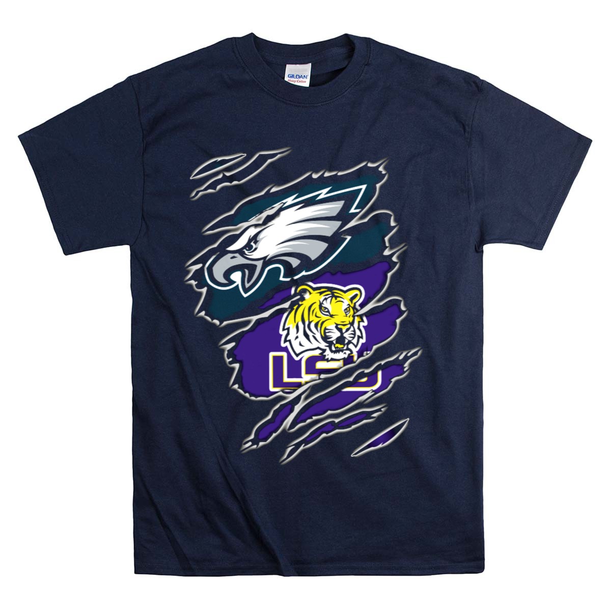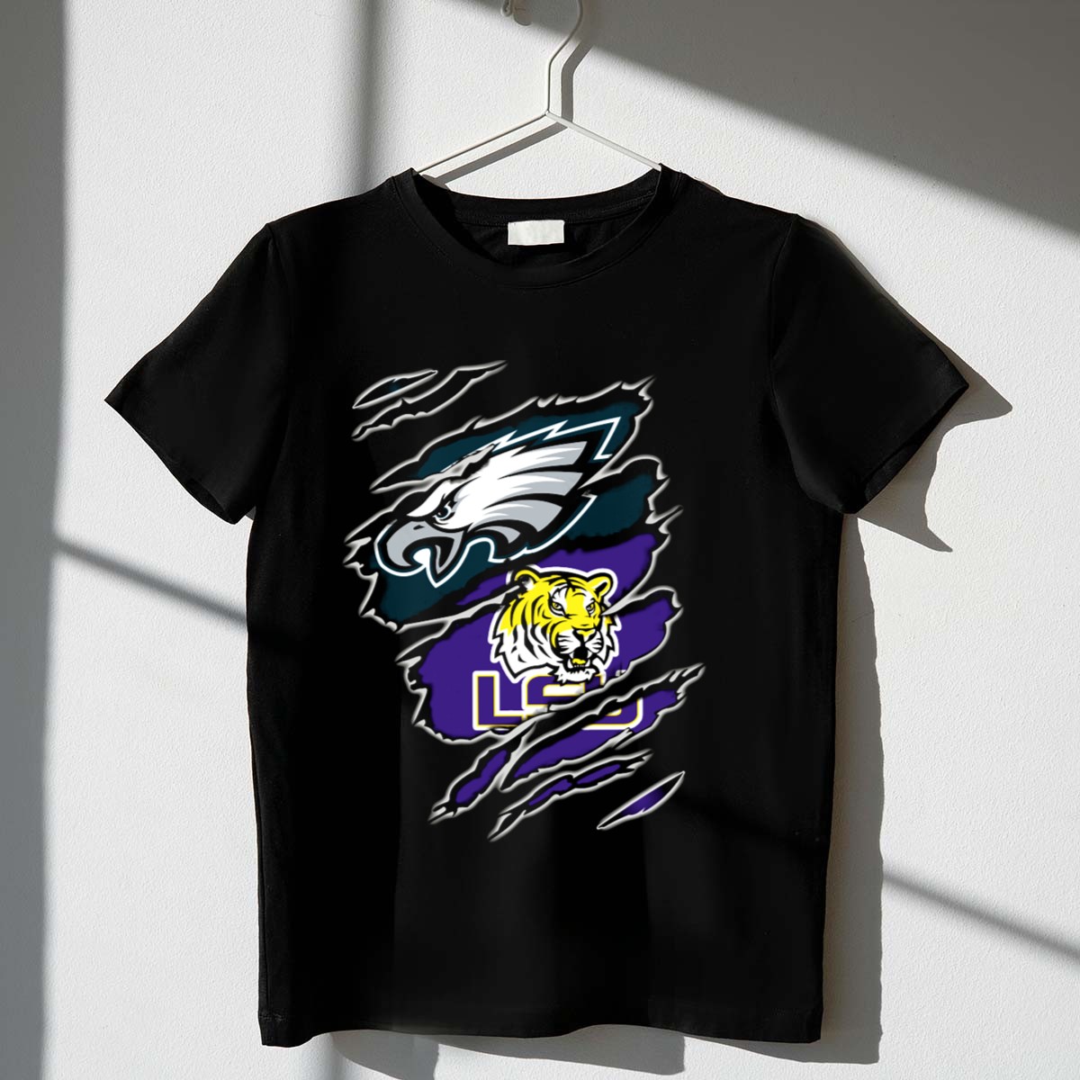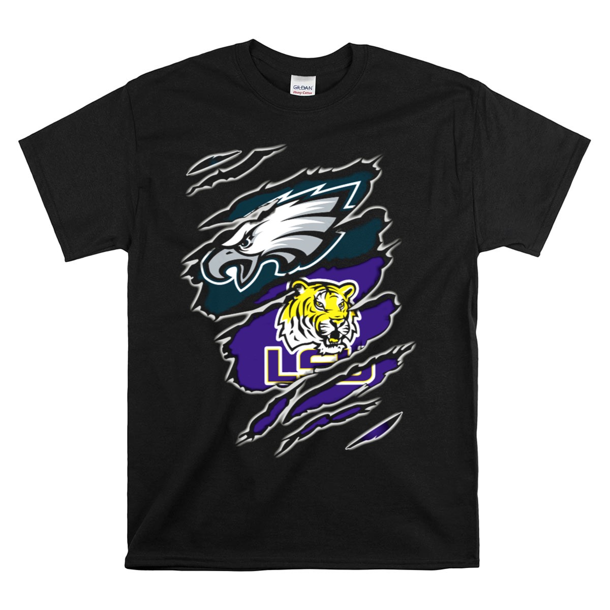 Show your team spirit with our Philadelphia Eagles LSU Tigers Ripped T-Shirt, perfect for die-hard fans who want to celebrate both their favorite NFL team and college powerhouse. Crafted for comfort and style, this shirt is ideal for casual outings, themed events, or just lounging around while supporting your teams. The unique fan-made design adds a touch of individuality, making it a must-have addition to any sports enthusiast’s wardrobe.