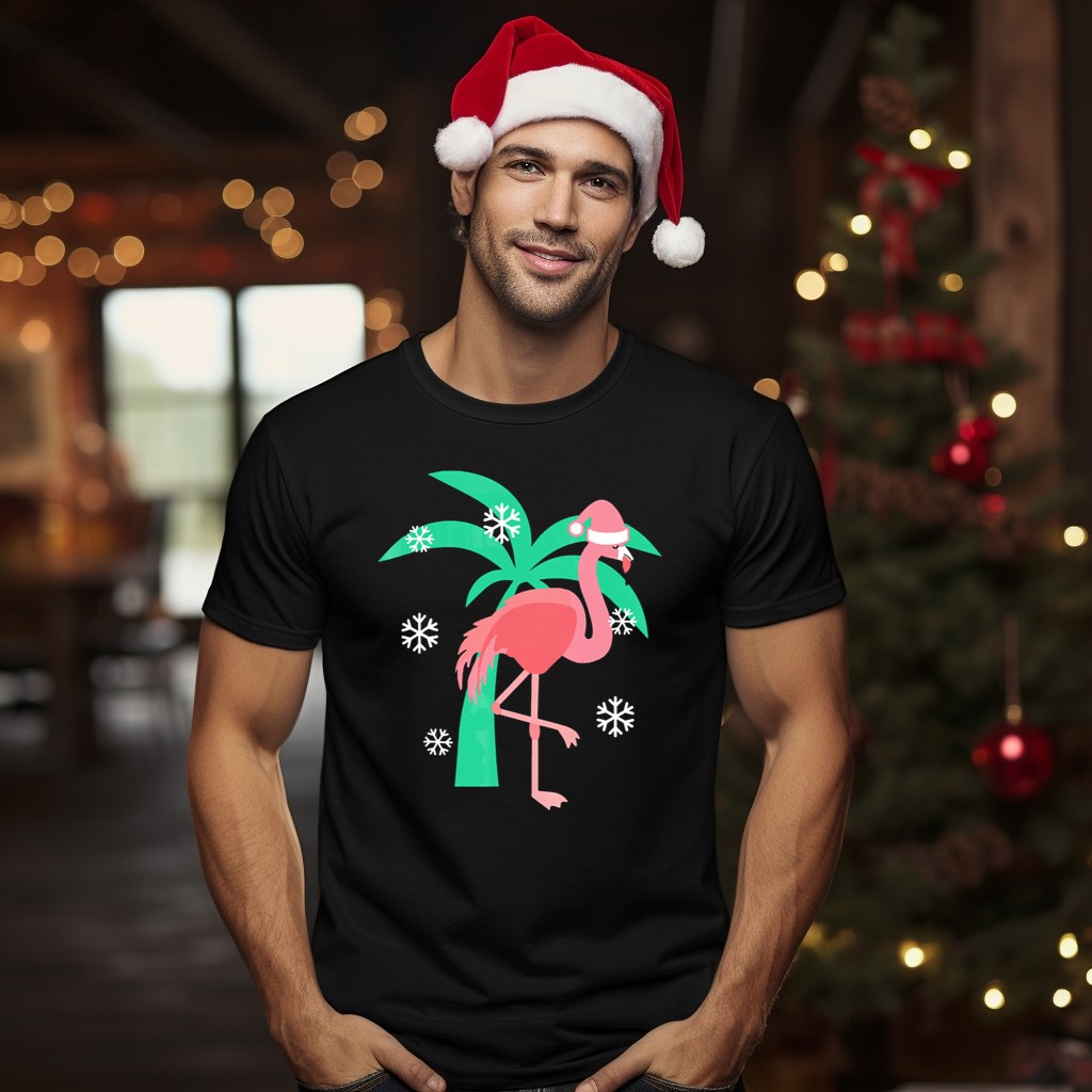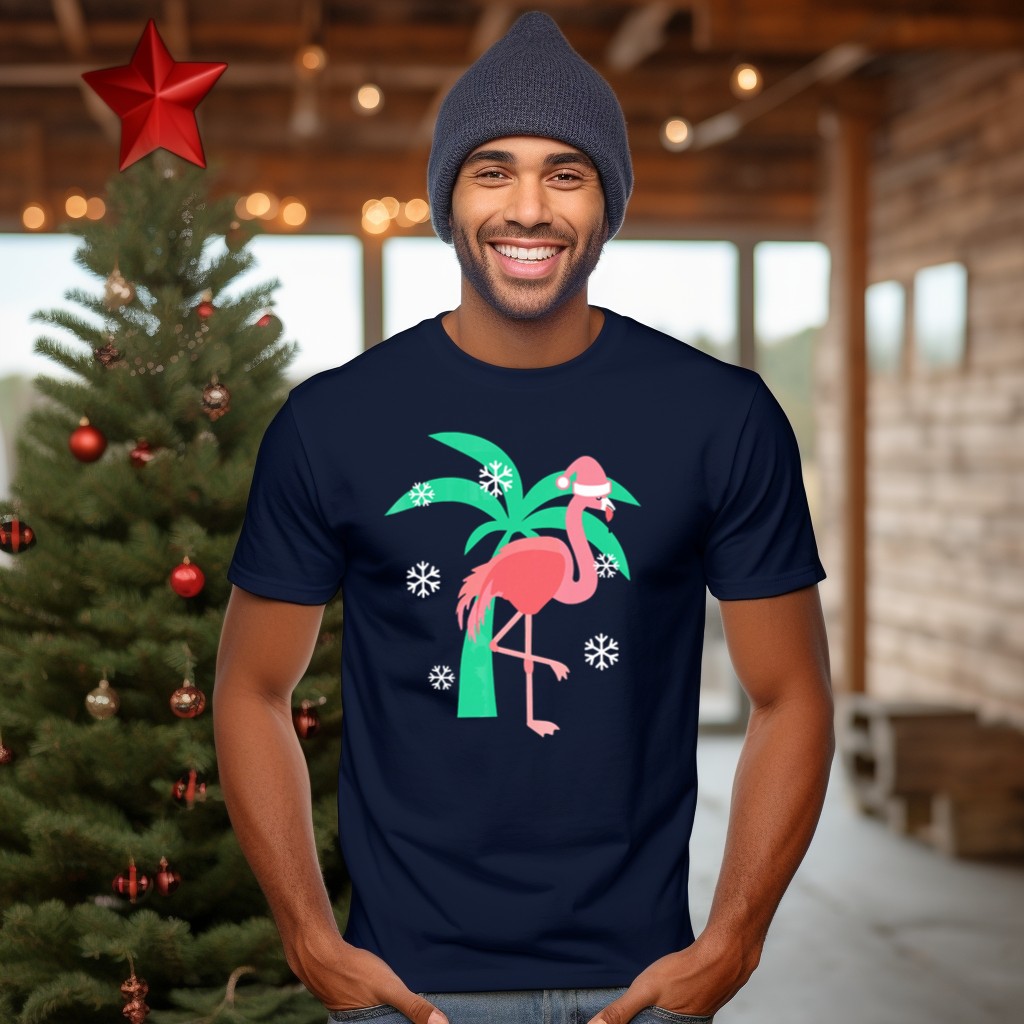 Celebrate the holiday season with a splash of tropical flair in our Pink Flamingo With Santa Hat And Palm Tree Snowflakes Christmas T-Shirt. This whimsical and fan-made design is perfect for those who want to bring a unique twist to their festive wardrobe. Ideal for casual wear, themed events, or just lounging around, this shirt is a fun way to express your holiday spirit while staying comfortable and stylish.