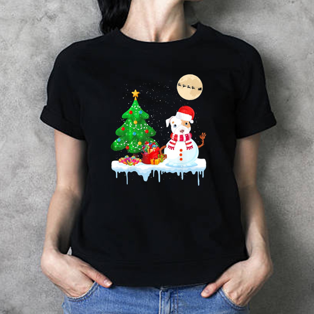 Get into the festive spirit with our Pit Bull Snowman With Santa Hat And Christmas Tree Moon And Sleigh T-Shirt! This fun and unique design is perfect for dog lovers and holiday enthusiasts alike, making it a great choice for casual wear, themed events, or just spreading some cheer during the holiday season. Made with love and printed in the USA, this shirt is sure to bring smiles wherever you go.