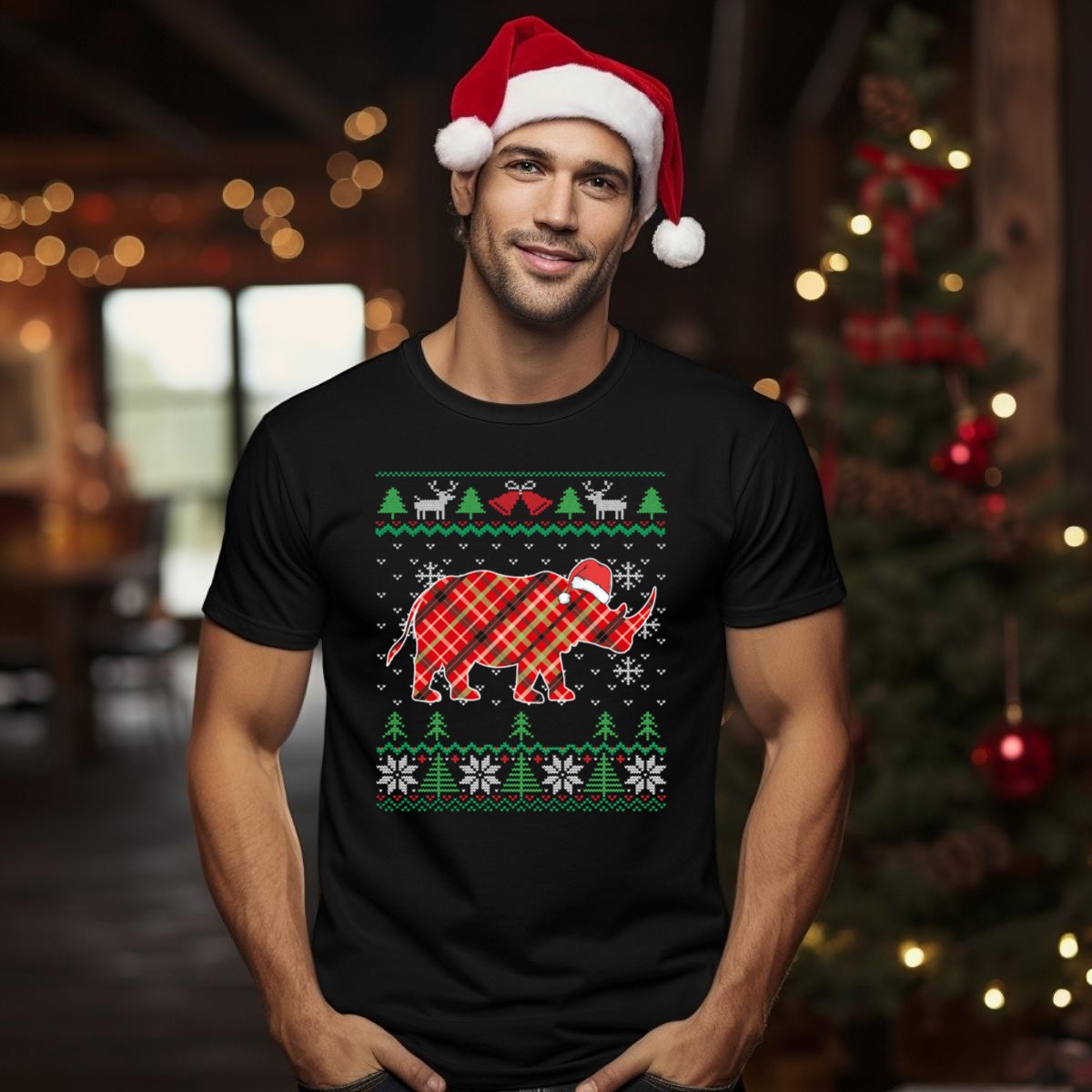 Get into the festive spirit with our Plaid Rhino Santa Hat Christmas Ugly Sweater T-Shirt! Perfect for animal lovers and holiday enthusiasts alike, this fan-made design features a whimsical African rhinoceros donning a classic Santa hat, surrounded by charming snowflakes. Ideal for casual wear, themed events, or simply spreading cheer during the holiday season, this shirt is sure to make you stand out in any crowd. Plus, with its soft and breathable fabric, you’ll be comfortable all day long!