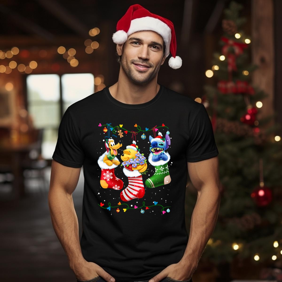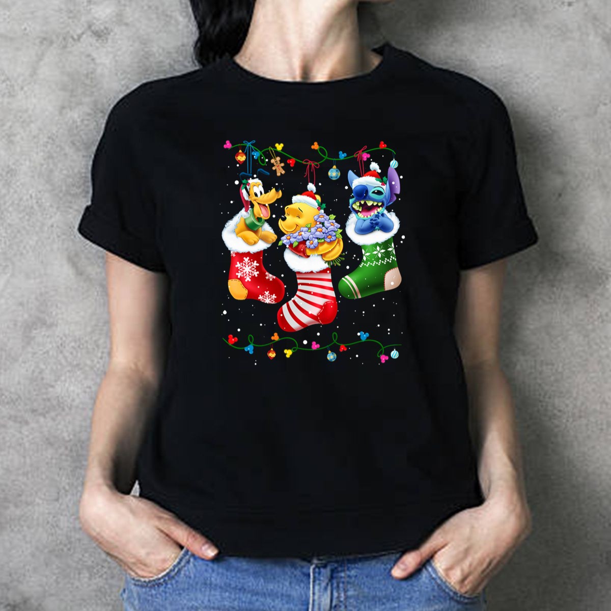 Pluto Stitch Pooh Christmas Stockings Festive Holiday Cartoon Characters T Shirt