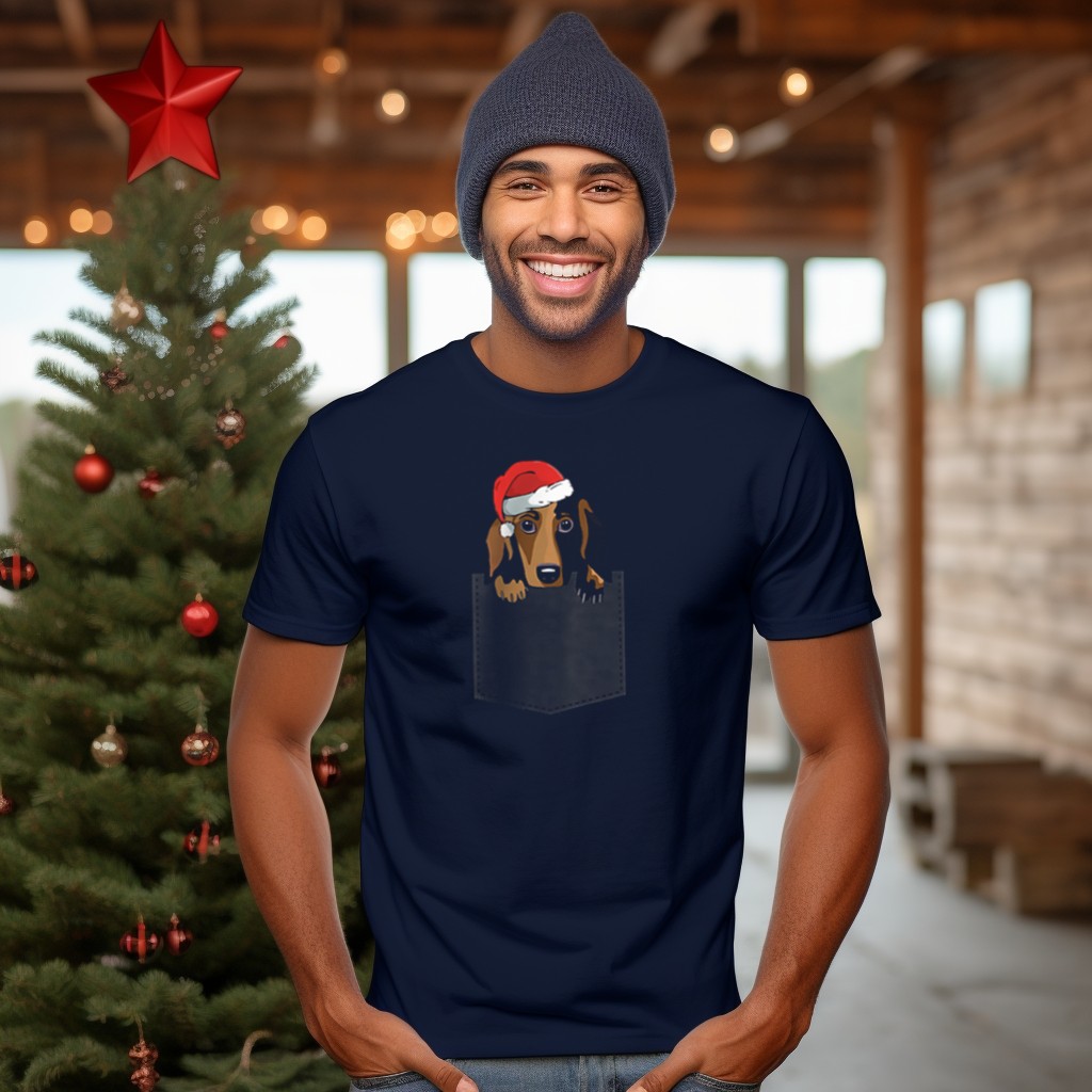 Celebrate the festive season with our charming Pocket Dachshund Christmas Santa Hat T-Shirt! Perfect for dog lovers and holiday enthusiasts alike, this delightful tee features an adorable dachshund peeking out of a pocket, complete with a jolly Santa hat. Ideal for casual wear, themed events, or just spreading holiday cheer during your daily adventures, this fan-made design is printed with care in the USA. Embrace the joy of the season with a touch of whimsy and let your love for dachshunds shine!
