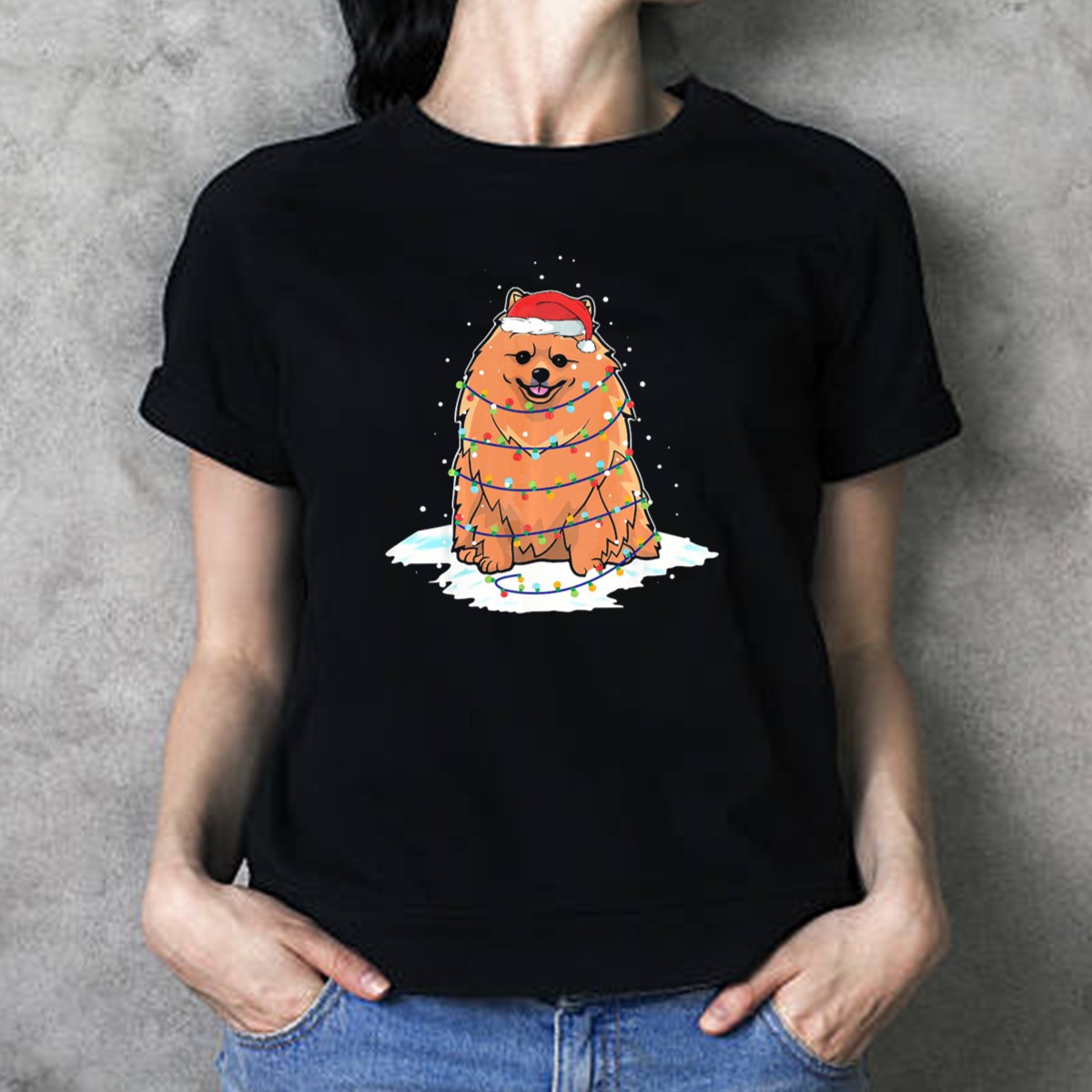 Be the first to review “Pomeranian Santa Wrapped In Christmas Lights On Snowy Ground T-Shirt”