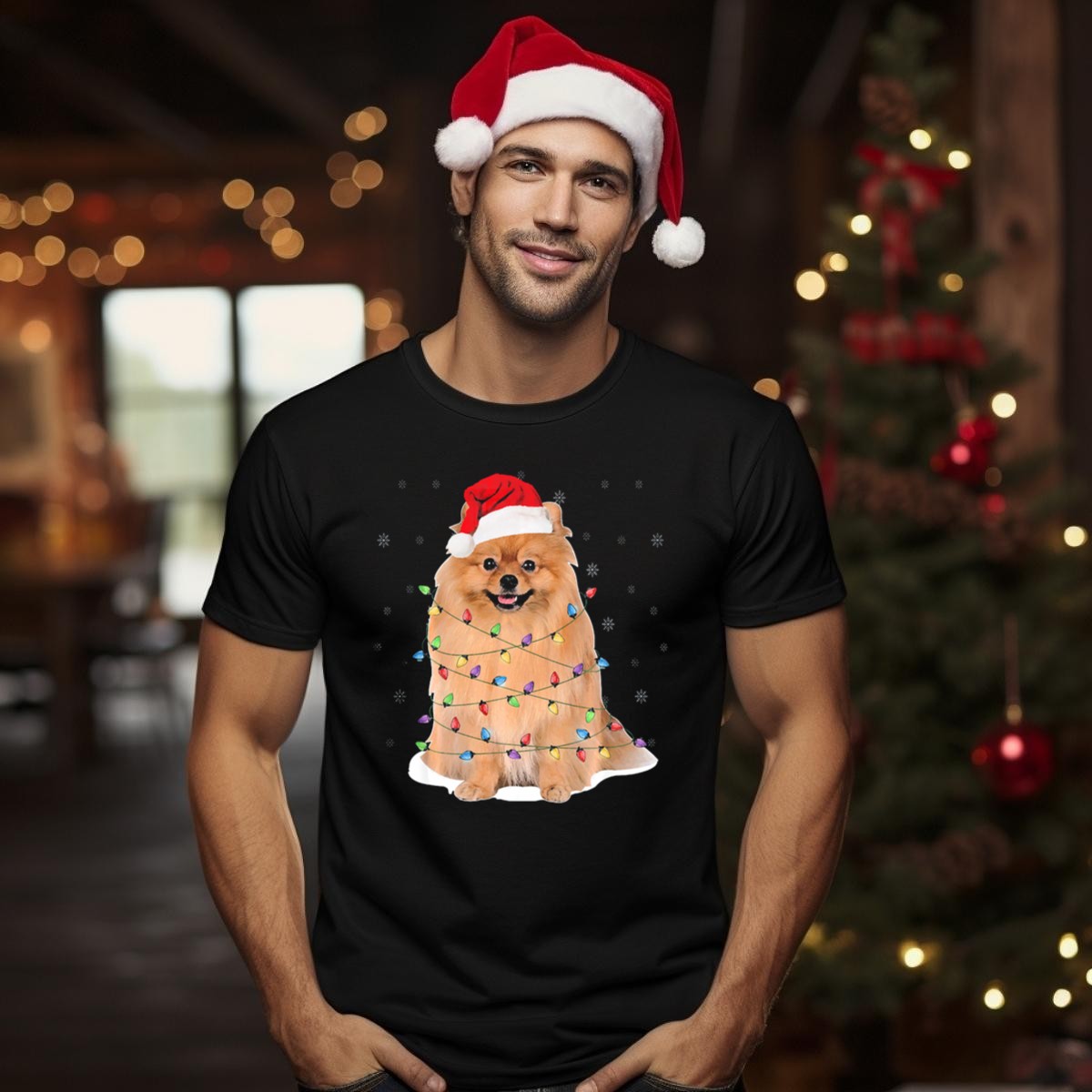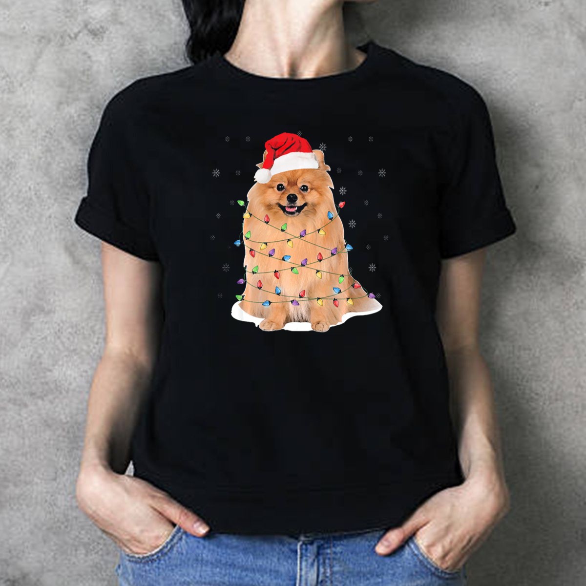 Be the first to review “Pomeranian Wrapped In Christmas Lights With Santa Hat And Snowflakes T Shirt”