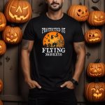 Embrace the spirit of Halloween with our “Protected By Flying Monkeys” T-shirt, featuring a whimsical witch silhouette against a haunting orange moon and mansion scene. Perfect for those who love to celebrate the spooky season, this shirt is designed for fans of all ages who appreciate a touch of magic in their casual wear. Made for themed events, parties, or just a fun day out, this fan-made design is printed in the USA, ensuring quality and uniqueness in every piece.