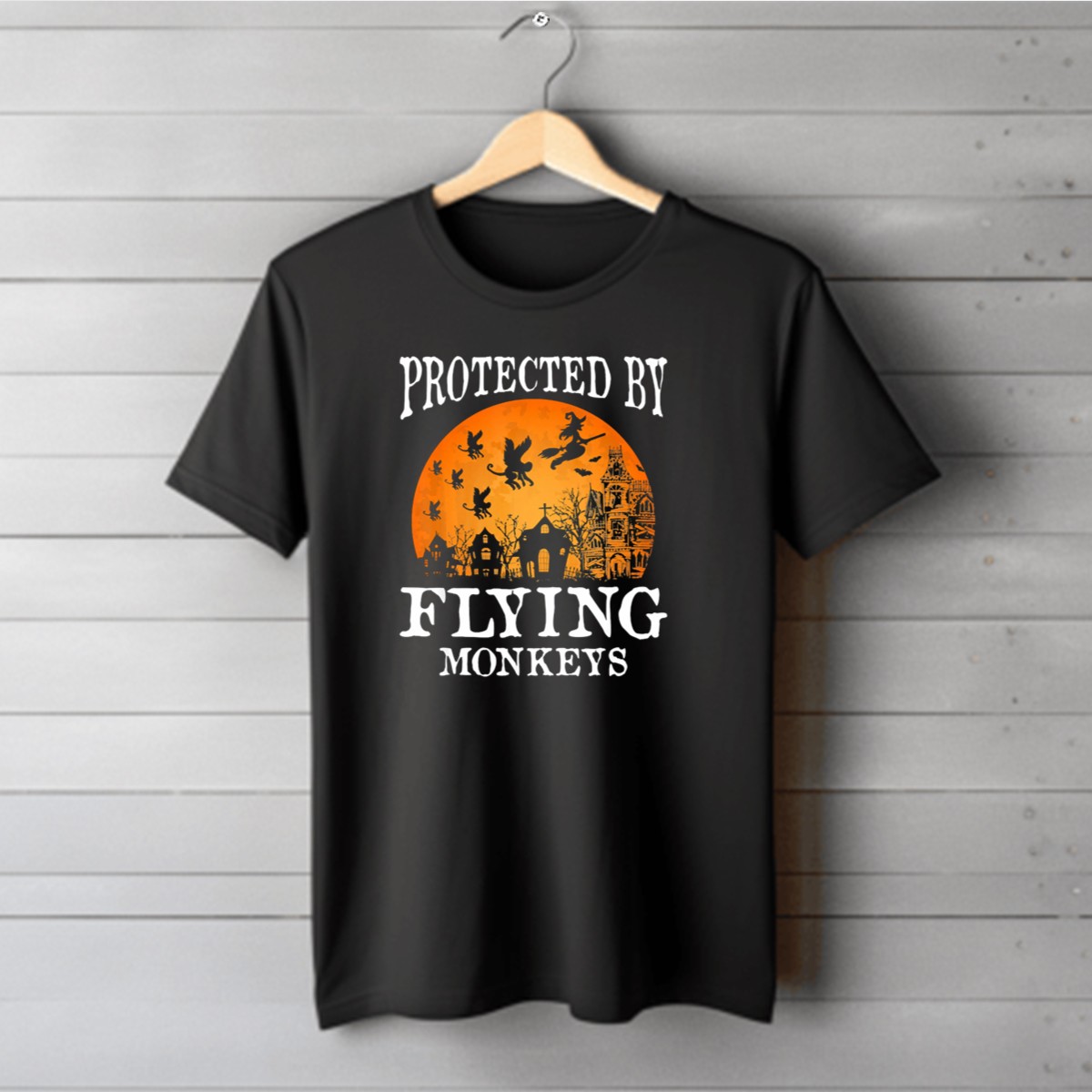 Be the first to review “Protected By Flying Monkeys Halloween Witch Silhouette Orange Moon Mansion Scene T-Shirt”
