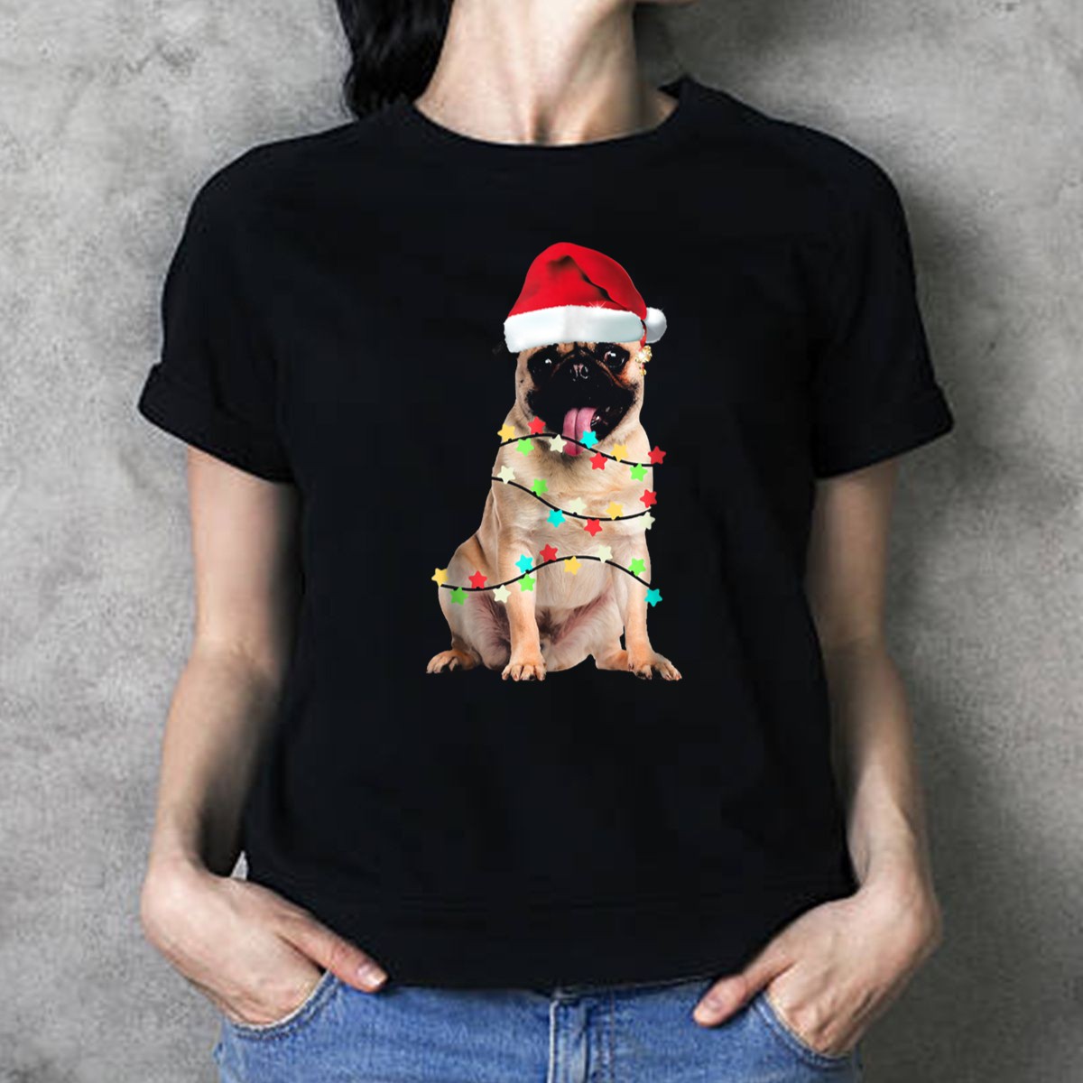 Be the first to review “Pug Santa Christmas Light Wrapping Festive Holiday Hat T Shirt”