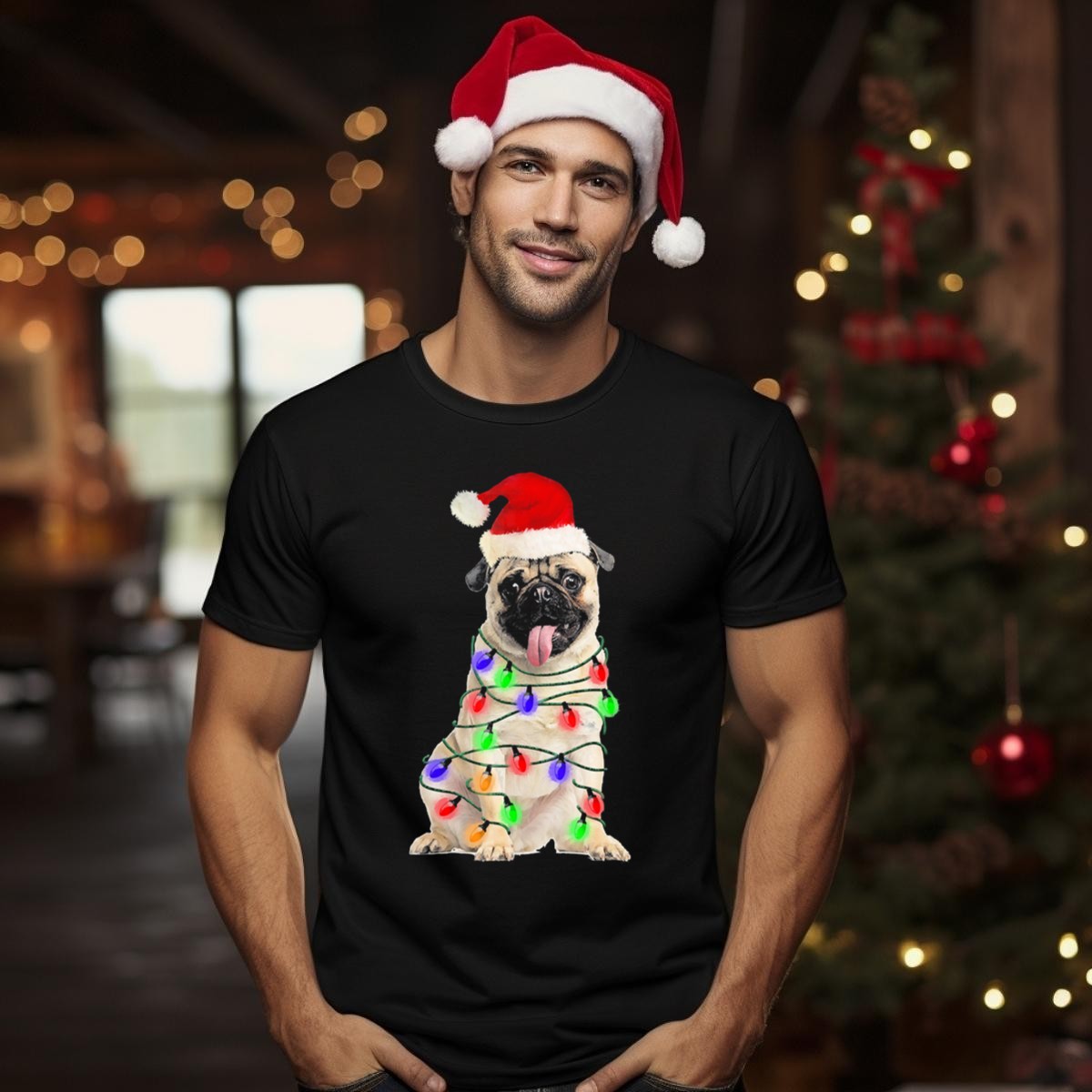 Get into the festive spirit with our adorable Pug Santa Hat Wrapped In Christmas Lights T-Shirt! This charming design is perfect for pug lovers and holiday enthusiasts alike, making it an ideal choice for casual wear, themed events, or simply spreading cheer during the holiday season. Crafted with care and printed in the USA, this shirt combines comfort with a playful design that’s sure to turn heads and spark smiles.