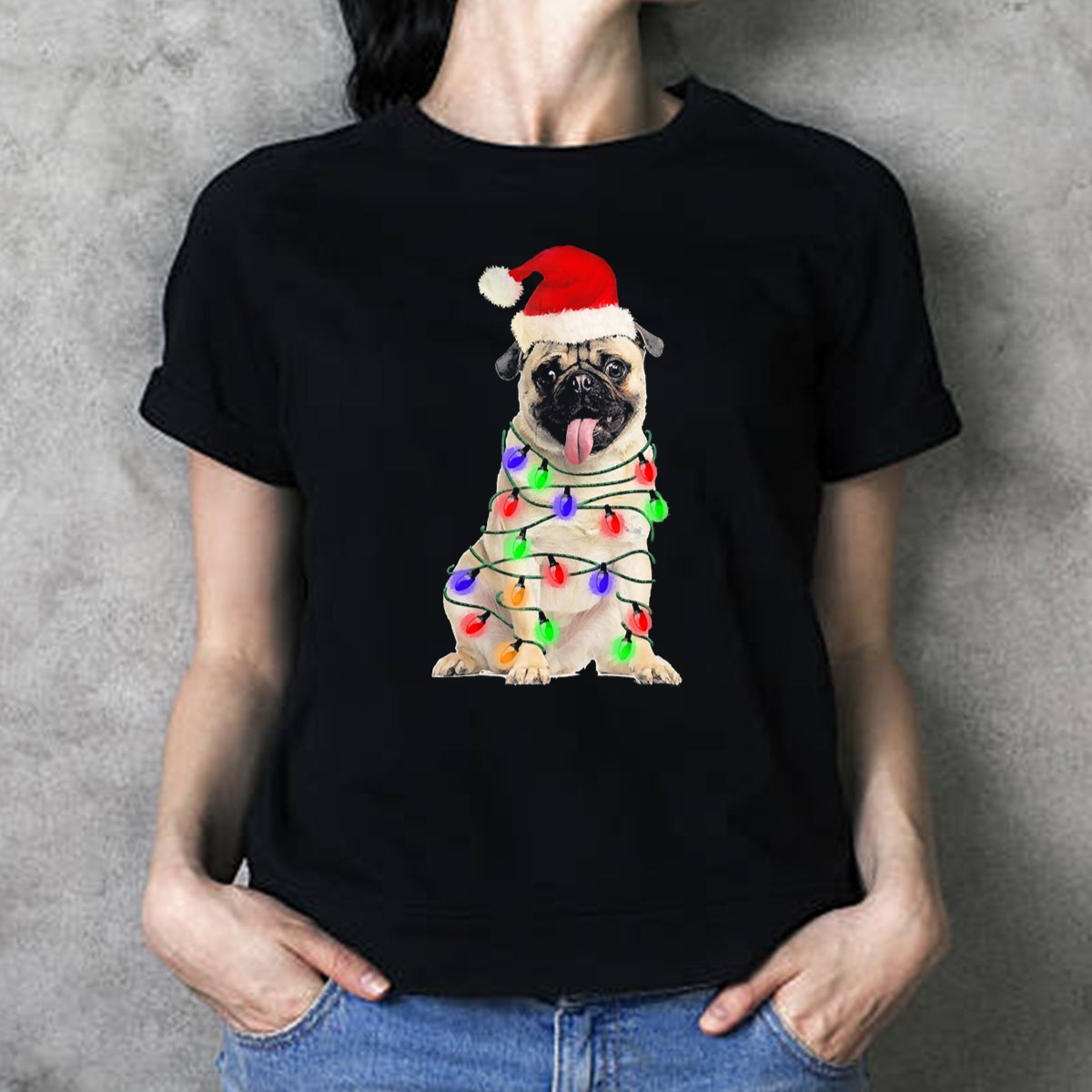 Be the first to review “Pug Santa Hat Wrapped In Christmas Lights T Shirt”