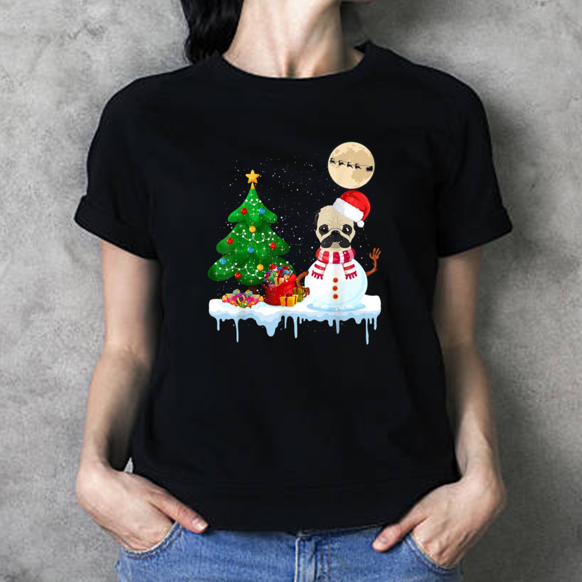 Pug Snowman Christmas Tree Santa Hat Moon Santa Sleigh T-Shirt