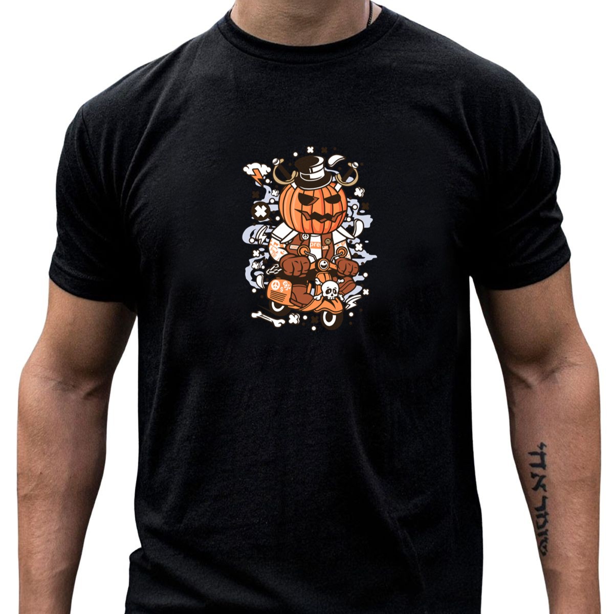 Be the first to review “Pumpkin Jack O Lantern Biker On Vintage Scooter With Pirate Themed Halloween Elements T-Shirt”