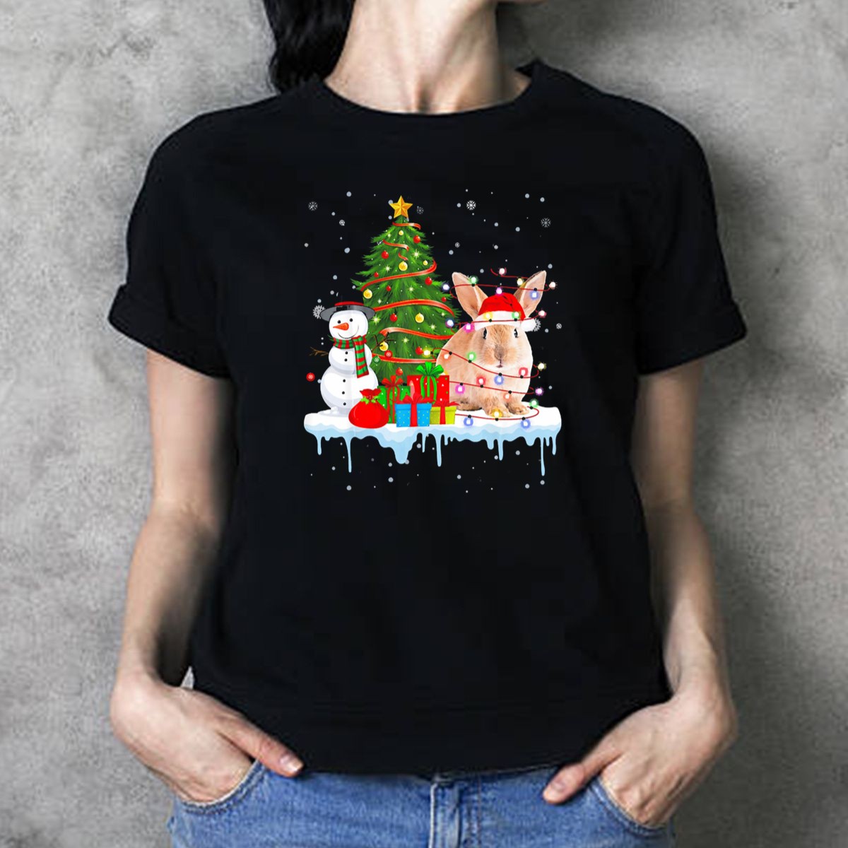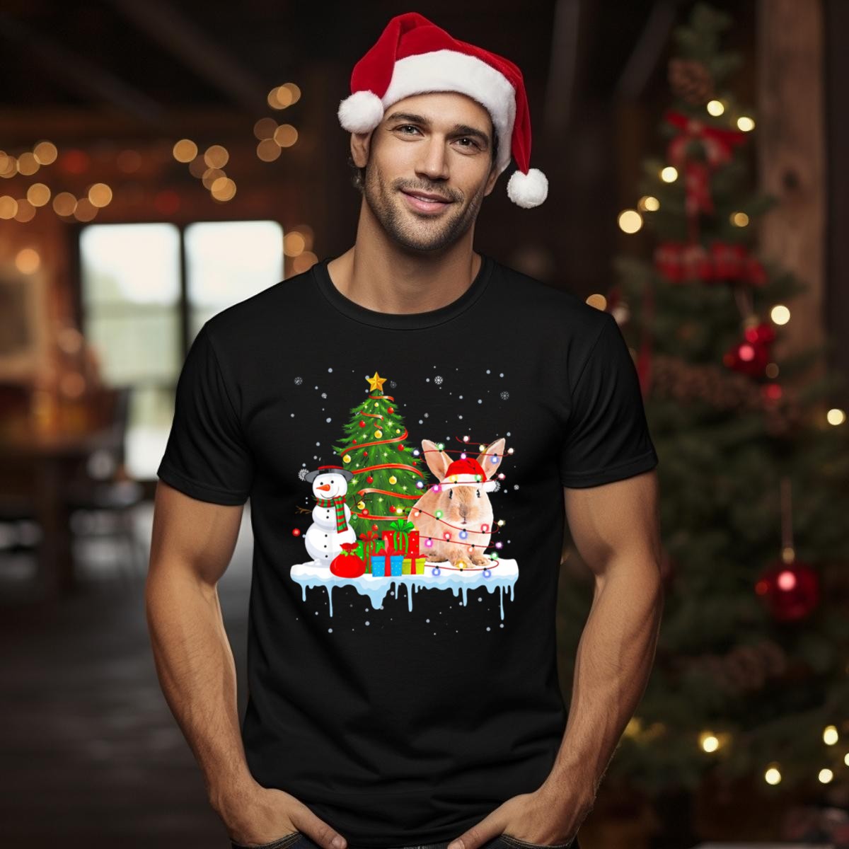 Be the first to review “Rabbit In Santa Hat With Christmas Lights Snowman And Tree T Shirt”