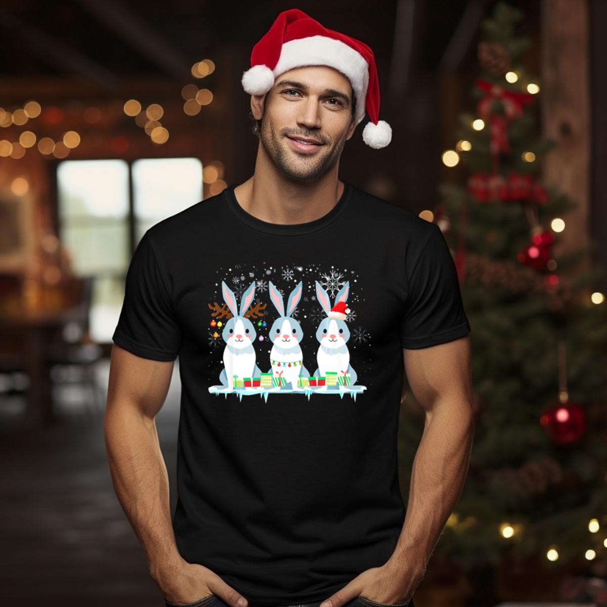 Celebrate the holiday season with our delightful Rabbit Trio T-shirt, featuring adorable rabbits donned in festive Christmas hats and surrounded by twinkling lights, snowflakes, and gifts! Perfect for animal lovers and holiday enthusiasts alike, this shirt is a fantastic choice for casual wear, themed events, or simply spreading cheer during daily outings. Made with love in the USA, this fan-made design combines comfort and style, making it a unique addition to your wardrobe this season.
