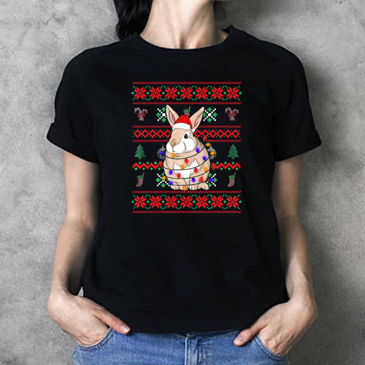 Be the first to review “Rabbit Ugly Christmas Sweater Santa Lights T Shirt”