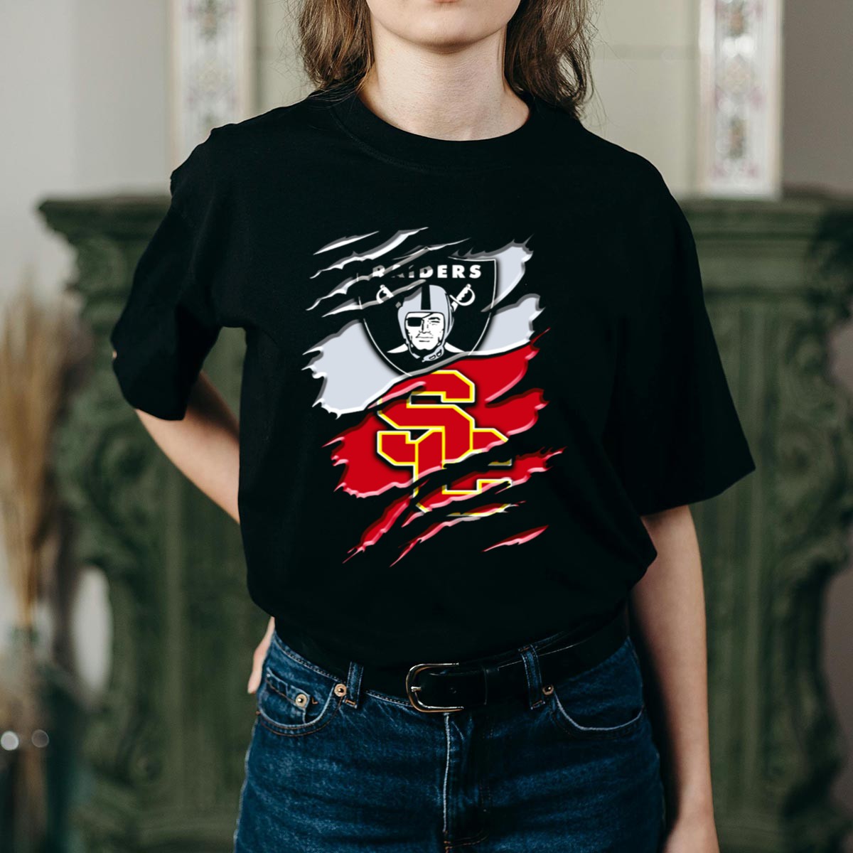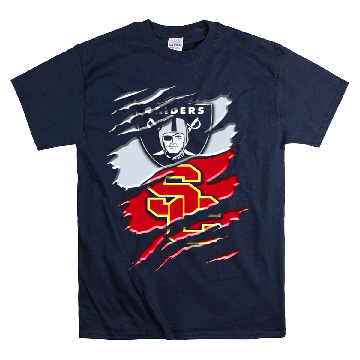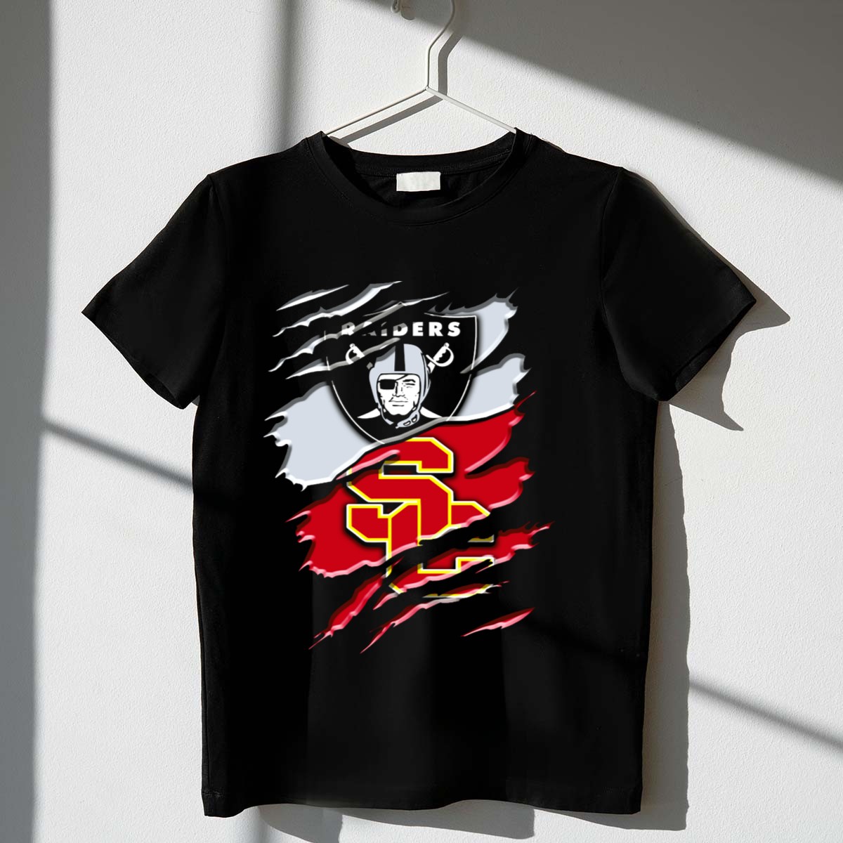 Introducing the Raiders and USC Trojans Logo Fusion T-Shirt, a must-have for fans who love to showcase their passion for football in style! This unisex tee is perfect for casual outings, themed events, or simply lounging around while cheering for your favorite teams. Its unique fan-made design features a striking fusion of the Raiders and USC Trojans logos, printed right here in the USA, making it a standout piece for any sports enthusiast.