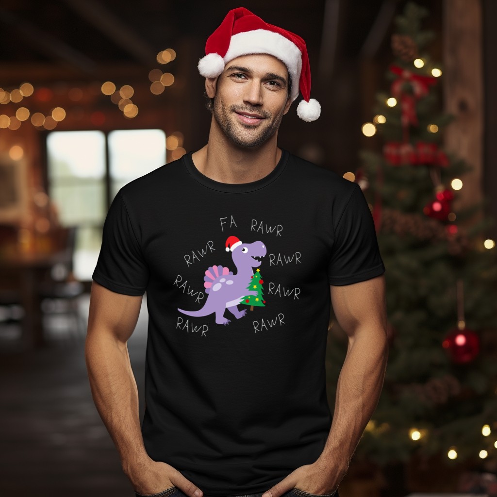 Unleash your holiday spirit with our Rawr Fa Christmas Dino T-Rex Santa Hat T-Shirt! Perfect for dinosaur lovers and festive enthusiasts alike, this playful tee adds a fun twist to your casual wear. Ideal for themed events, family gatherings, or just lounging around during the holidays, this shirt showcases a fan-made design printed in the USA that will surely make you stand out in any crowd.